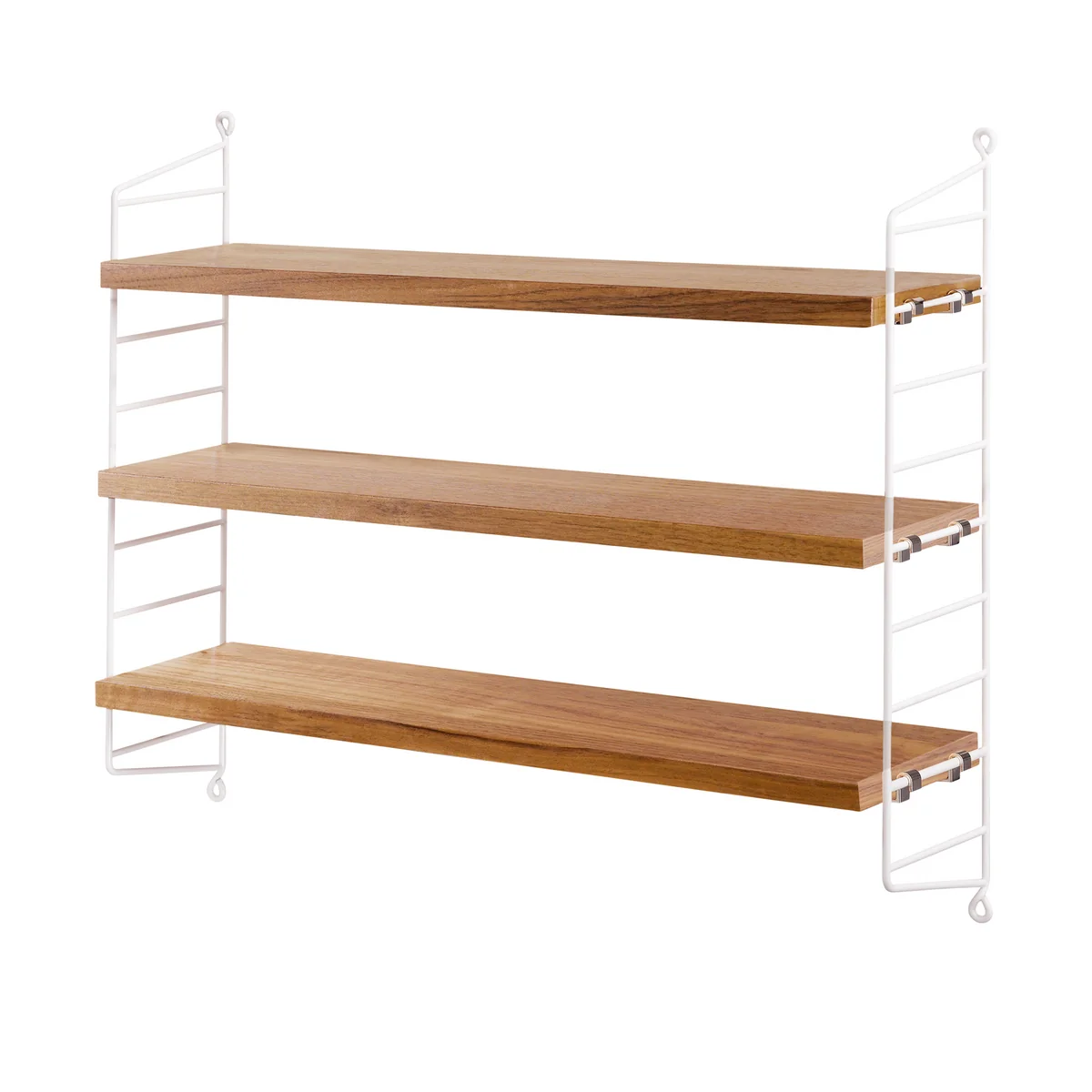 Combineren. Varieer. Voeg toe. Verander de kleur. Verander de muur. Het kleine broertje van het grote String rekkensysteem is de Pocket plank. Het compacte wandrek van de fabrikant is ideaal voor paperbackboeken, cd's en dvd's en biedt dezelfde voordelen als het String systeem.