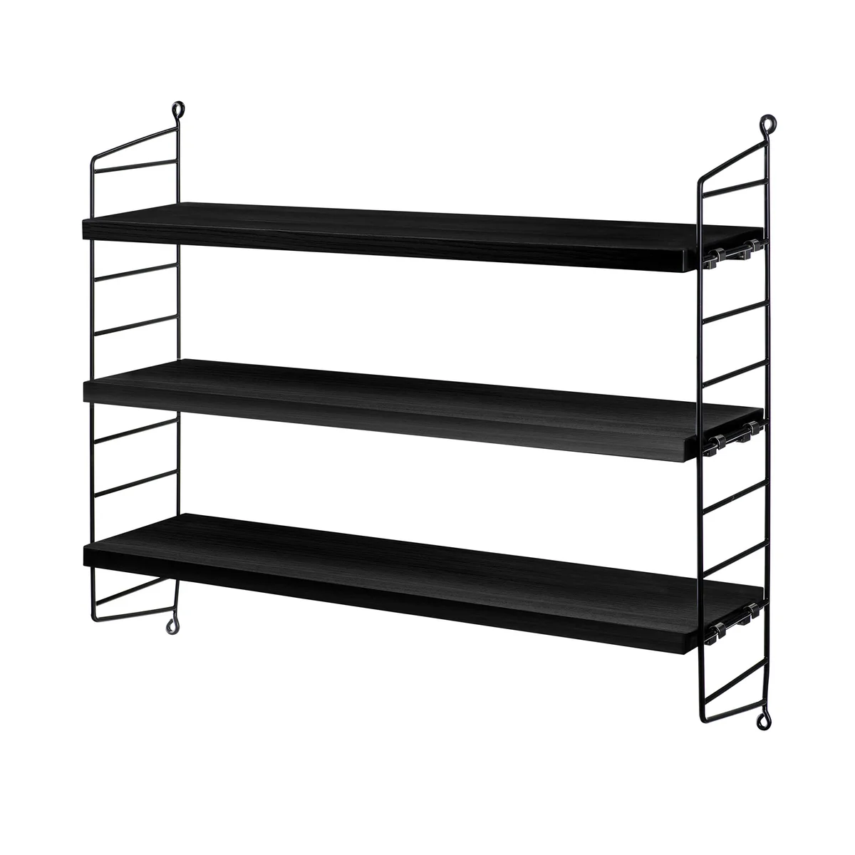 Combineren. Varieer. Voeg toe. Verander de kleur. Verander de muur. Het kleine broertje van het grote String rekkensysteem is de Pocket plank. Het compacte wandrek van de fabrikant is ideaal voor paperbackboeken, cd's en dvd's en biedt dezelfde voordelen als het String systeem.