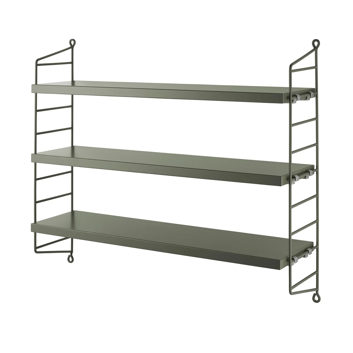 Combineren. Varieer. Voeg toe. Verander de kleur. Verander de muur. Het kleine broertje van het grote String rekkensysteem is de Pocket plank. Het compacte wandrek van de fabrikant is ideaal voor paperbackboeken, cd's en dvd's en biedt dezelfde voordelen als het String systeem.