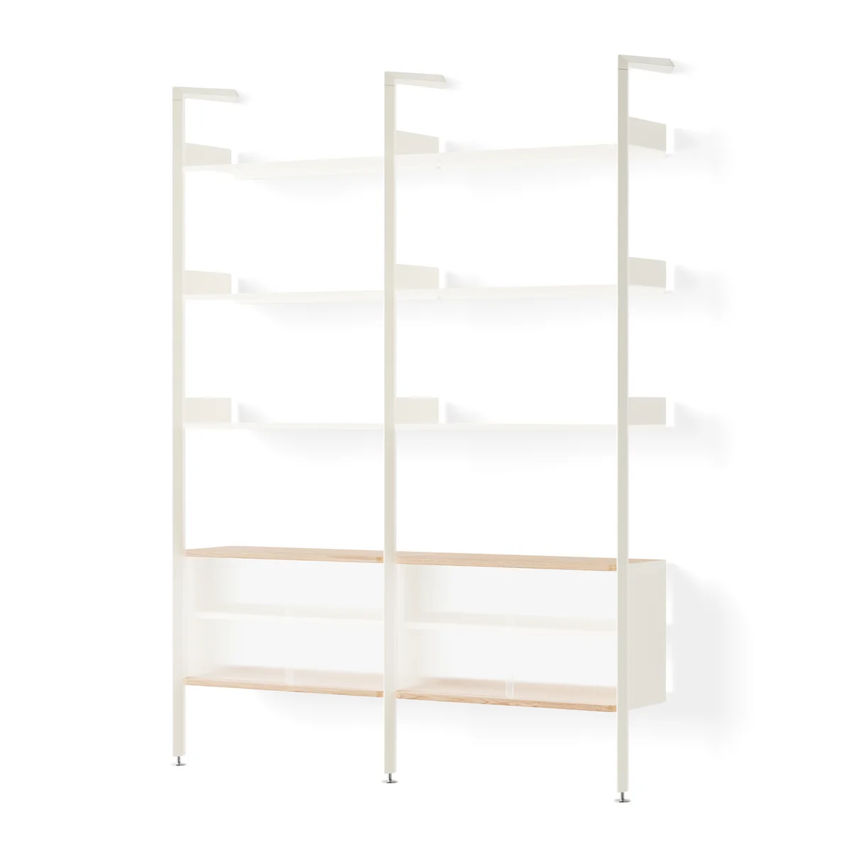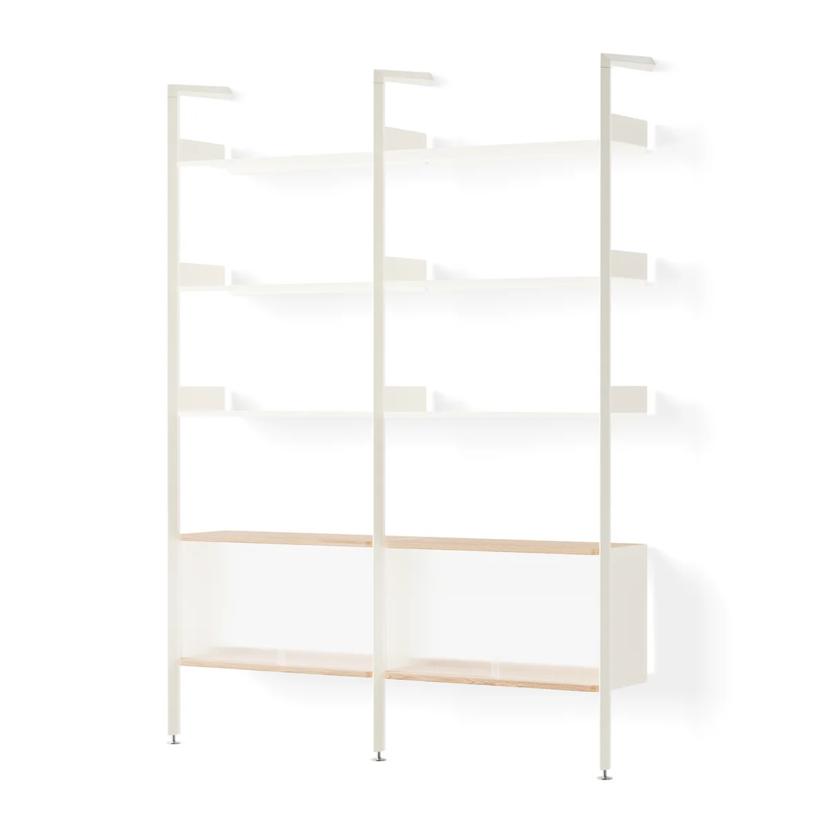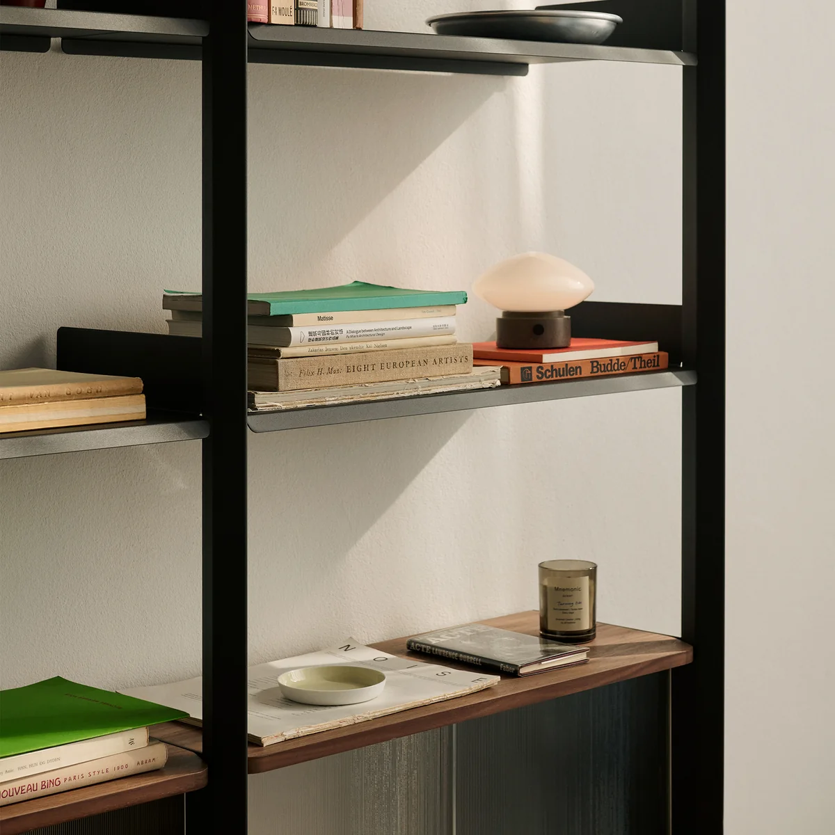 De Rombe-rekkenkast in configuratie E met IF3 & IF6-elementen combineert modern design met hoge functionaliteit. De combinatie van open schappen en een gesloten kastmodule met geribbeld glas creëert een evenwicht tussen presentatie en opslag. Hierdoor is de kast niet alleen een praktisch meubelstuk, maar ook een stijlvol statement in de woon- of werkruimte.