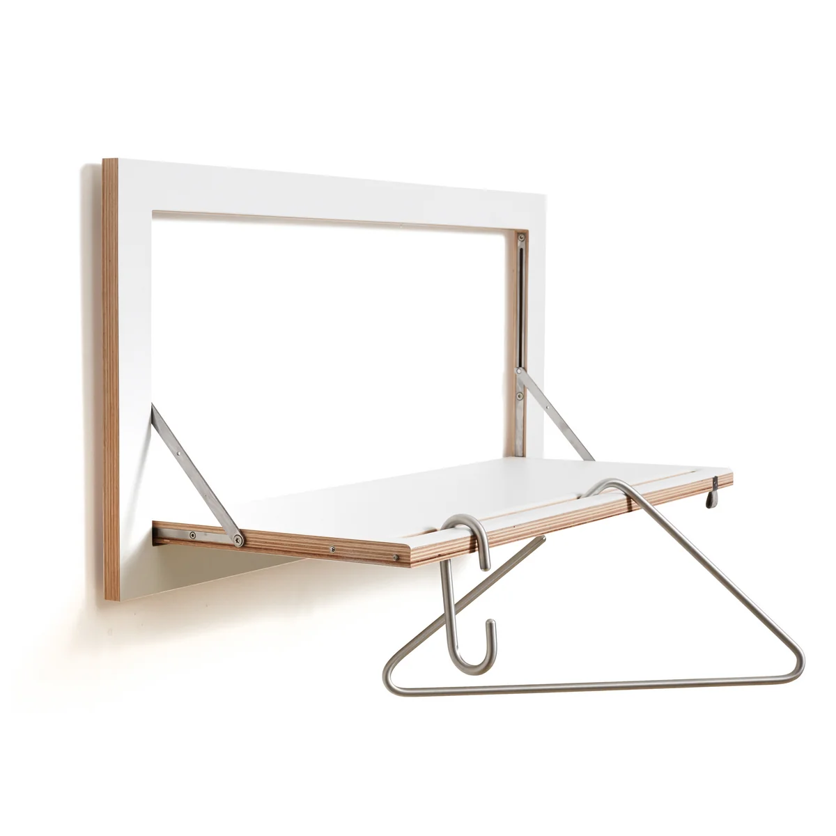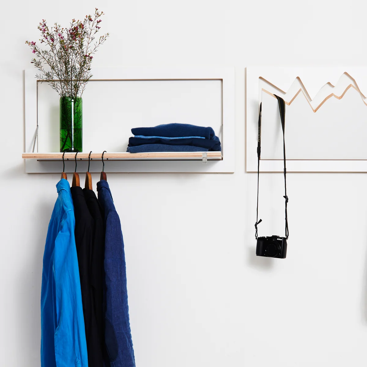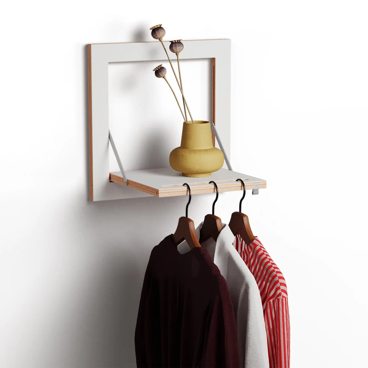 Fläpps De kledingroede van Ambivalenz lijkt op het eerste gezicht een gewone wandplank van Ambivalenz en is pas in tweede instantie herkenbaar als kledingstang met extra opbergruimte als de kapstok is uitgeklapt. Ingeklapt geeft alleen een smalle gleuf de extra functie aan. Jassen, jacks, tassen, sjaals en nog veel meer kunnen aan de kapstok worden opgeborgen met behulp van haken en hangers. De plank is ontworpen voor sleutels, een leesbril en een portemonnee.