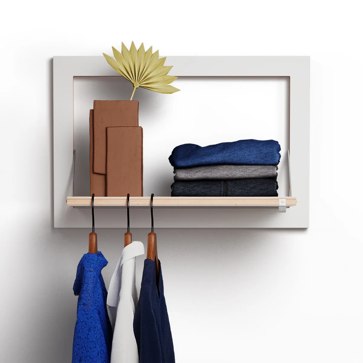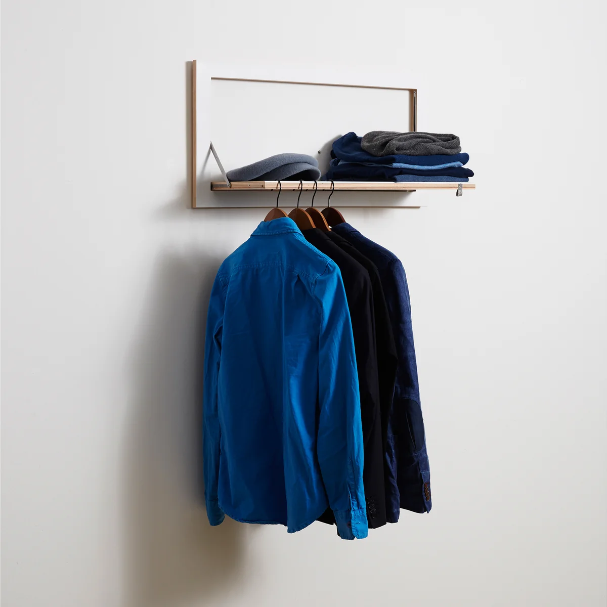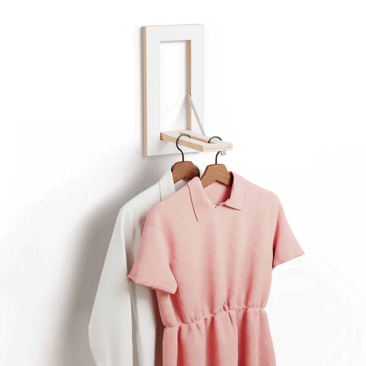 Fläpps De kledingroede van Ambivalenz lijkt op het eerste gezicht een gewone wandplank van Ambivalenz en is pas in tweede instantie herkenbaar als kledingstang met extra opbergruimte als de kapstok is uitgeklapt. Ingeklapt geeft alleen een smalle gleuf de extra functie aan. Jassen, jacks, tassen, sjaals en nog veel meer kunnen aan de kapstok worden opgeborgen met behulp van haken en hangers. De plank is ontworpen voor sleutels, een leesbril en een portemonnee.