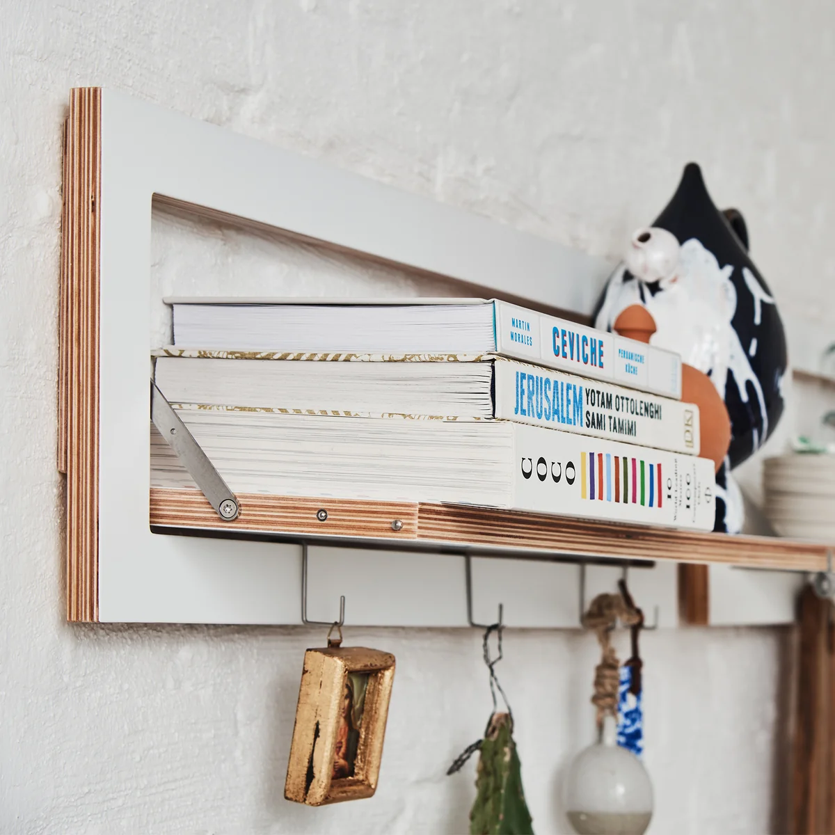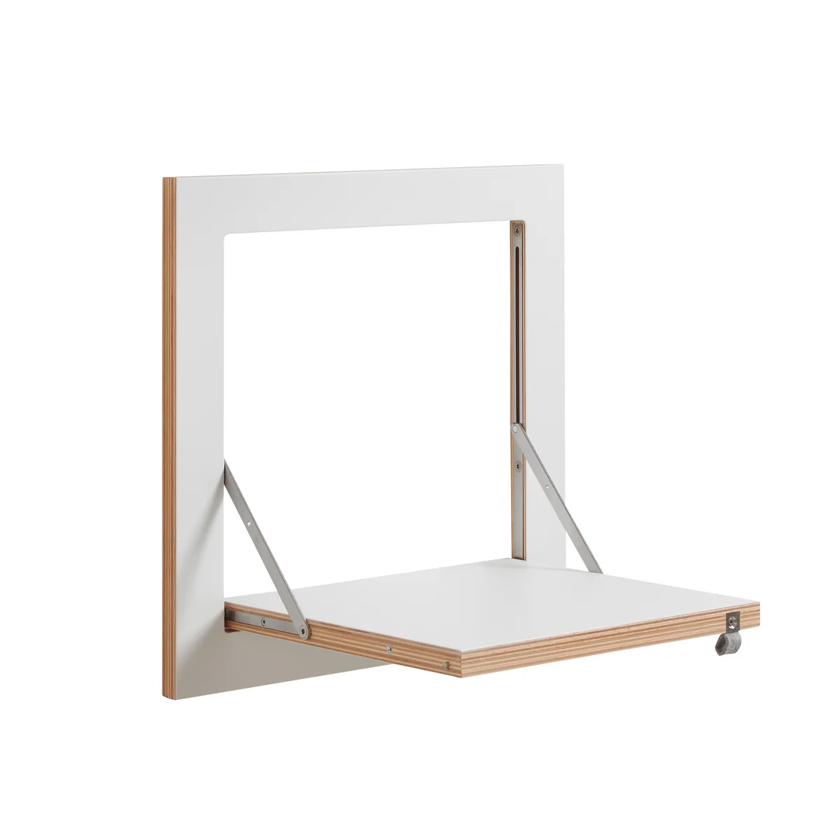 De planken zijn gemaakt van multiplex berkenhout met roestvrijstalen scharnieren. Ze worden met de hand gelakt en zijn verkrijgbaar in verschillende kleuren. Een kleine lus van vilt vergemakkelijkt het inklappen van de plank.