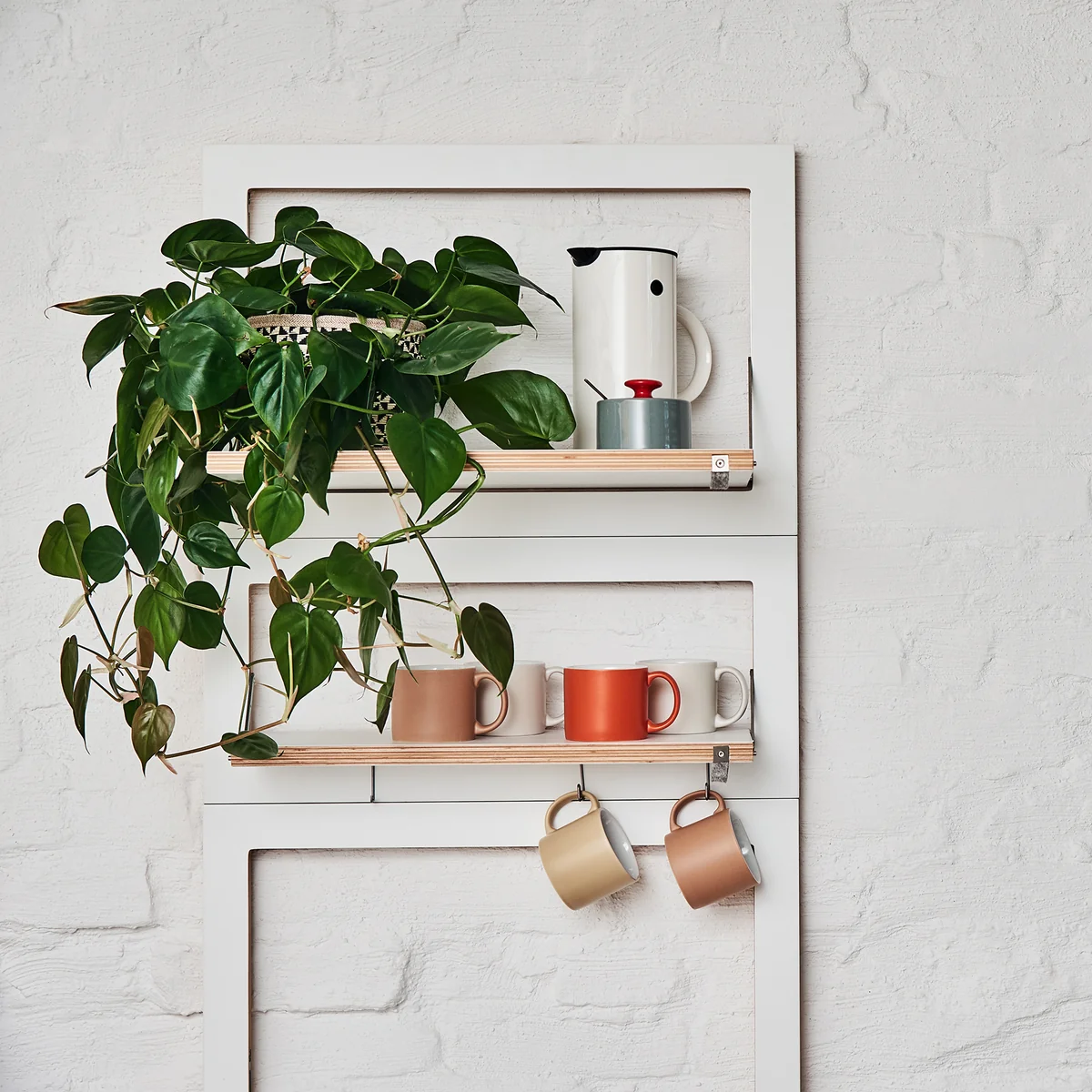 De kleine plank met één plank van 40 x 40 cm is zo vierkant als een bankkussen, alleen niet zo dik. Hij past zelfs in de kleinste flats en doet dienst als nachtkastje of eender welke plank. De smalle, slanke plank 60 x 27 cm met één plank is ideaal in de keuken voor specerijen, kruiden, olie of het open kookboek met de standaardlengte van keukenkastjes. De middelgrote plank 60 x 40 cm met één plank is het meest geschikt voor het kantoor met zijn 3:2 formaat en houdt dossiermappen op hun plaats. De smalle plank 80 x 27 cm met één plank neemt weinig ruimte in beslag en biedt over de lengte toch voldoende ruimte voor boeken. De grote plank van 80 x 40 cm is verkrijgbaar met één, twee of drie planken en biedt ruimte voor dikke boeken, vazen, koffiezetapparaten en nog veel meer.