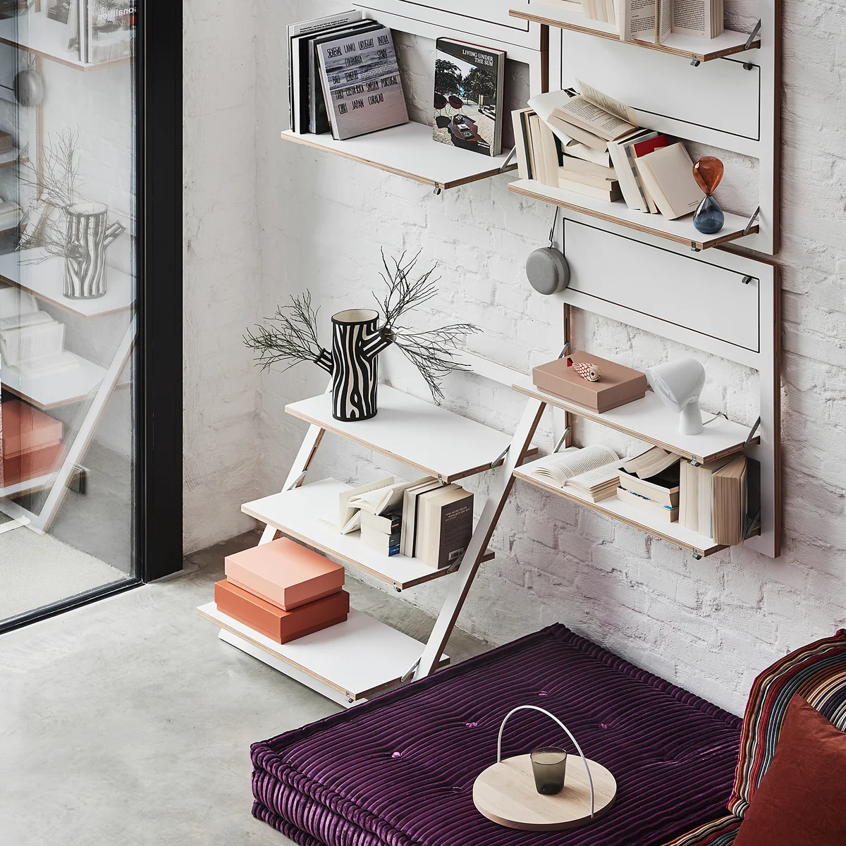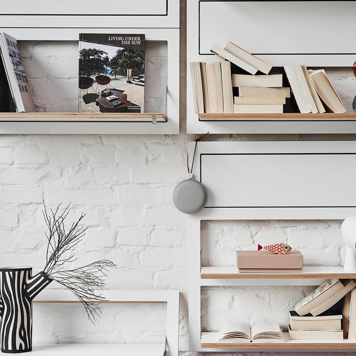 De Fläpps plank van Ambivalenz is een opvouwbare wandplank die in gesloten toestand compact en uiterst plat tegen de muur staat en in uitgeklapte toestand een multifunctioneel meubelstuk wordt. Het wandrek is verkrijgbaar in verschillende lengtes, hoogtes en kleuren met één of meerdere planken. Fläpps Het rek is klaar voor elke situatie en de woonruimte kan individueel en naar eigen behoefte worden ingericht.