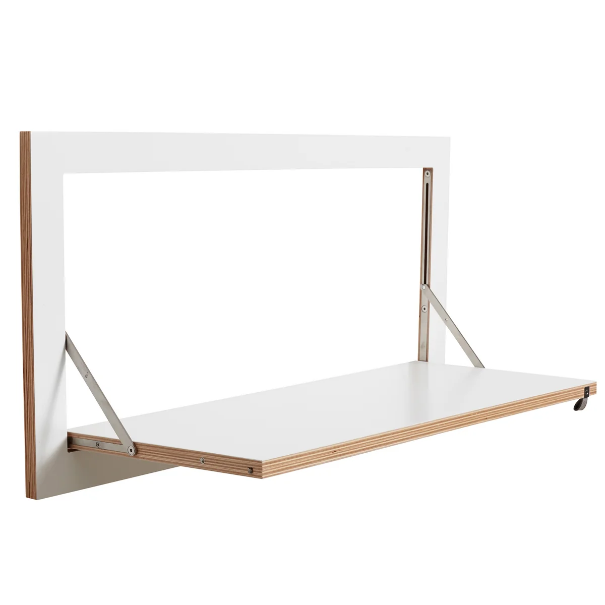 De planken zijn gemaakt van multiplex berkenhout met roestvrijstalen scharnieren. Ze worden met de hand gelakt en zijn verkrijgbaar in verschillende kleuren. Een kleine lus van vilt vergemakkelijkt het inklappen van de plank.