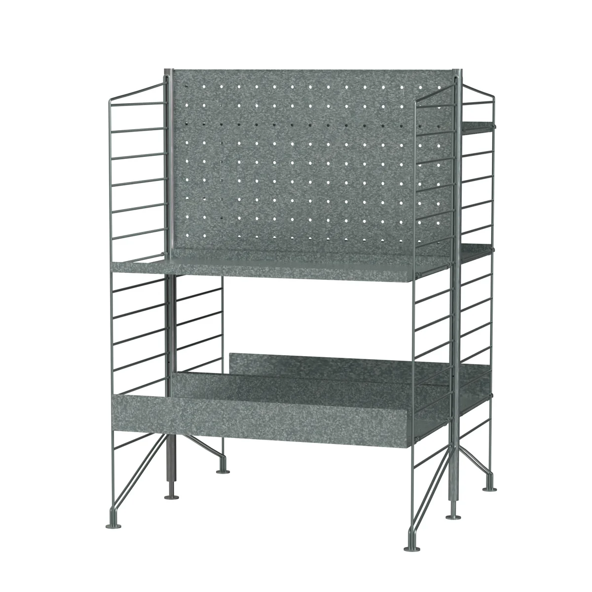 De Outdoor serie bestaat uit wandladders, vloerladders en metalen planken in verschillende maten en breedtes. Ze zijn allemaal gemaakt van gegalvaniseerd staal. Het gegalvaniseerde metaal is bestand tegen alle weersomstandigheden en geeft het String systeem een robuuste uitstraling.