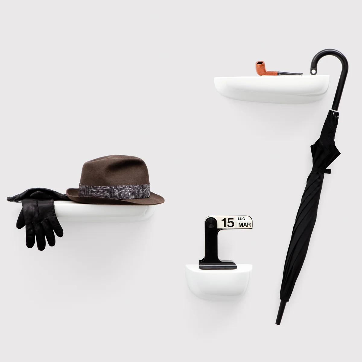 "Net zoals we dingen aan een steen hangen voordat we in het water springen, hebben we ook kleine mogelijkheden nodig om dingen op te bergen in ons dagelijks leven", legt Ronan Bouroullec uit. Dit is de reden waarom de Corniches geen normale of nog steeds horizontale rekken zijn, maar op de een of andere manier individueel, onafhankelijk en alleenstaand in de uitsteeksels die we zelf creëren.