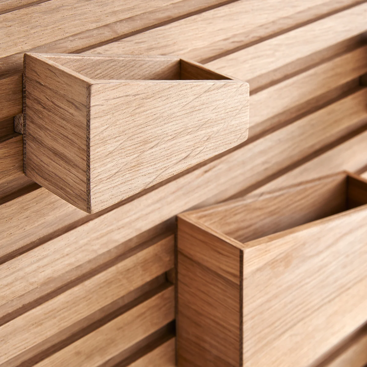 Het ontwerp is de perfecte oplossing om allerlei kleine voorwerpen systematisch te organiseren, of het nu als wandrek bij de ingang is of boven het bureau voor potloden, scharen en andere kantooraccessoires - met de Woud Input Organizer van massief eikenhout blijft uw dagelijks leven netjes.