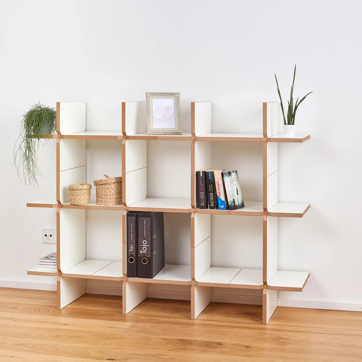 De elementen worden eenvoudigweg horizontaal en verticaal in elkaar gestoken, waardoor een uiterst stijlvol en stabiel geheel ontstaat.