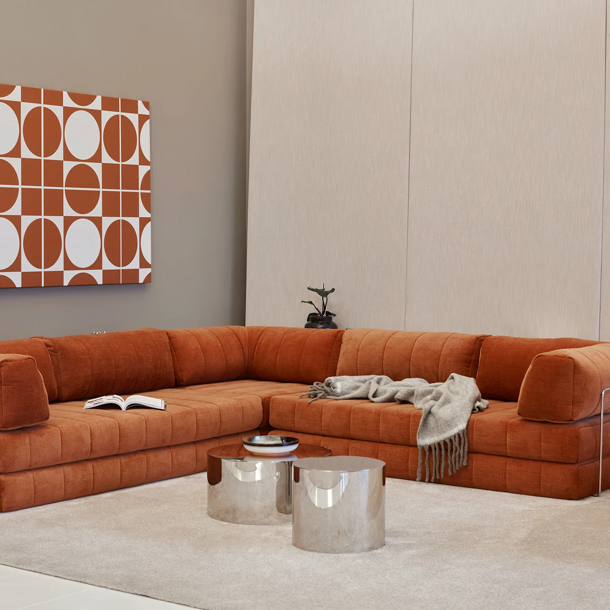 Kenmerkend zijn de L-vormige rugkussens, die een bijzonder ontspannen zit- en ligpositie mogelijk maken. Ze creëren een knus, omhullend effect en benadrukken het loungekarakter van de bank. Tegelijkertijd kunnen de losse kussens naar wens flexibel worden gerangschikt en verplaatst.
