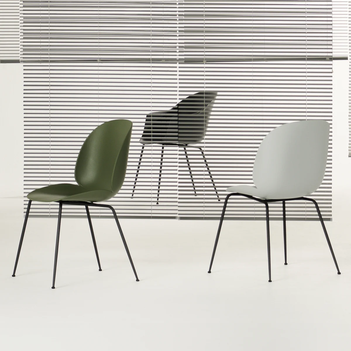 De Beetle Gubi Eetkamerstoel van GamFratesi is een stoel met onbeperkte mogelijkheden. Oorspronkelijk ontworpen als een gestoffeerde stoel, geeft de niet-gestoffeerde versie met polypropyleen schelpen de stoel een lichte en frisse uitstraling. Het ontwerpersduo liet zich inspireren door de wereld van insecten. Het ontwerp van de stoel is gebaseerd op de typische kenmerken van een kever. beetle ).