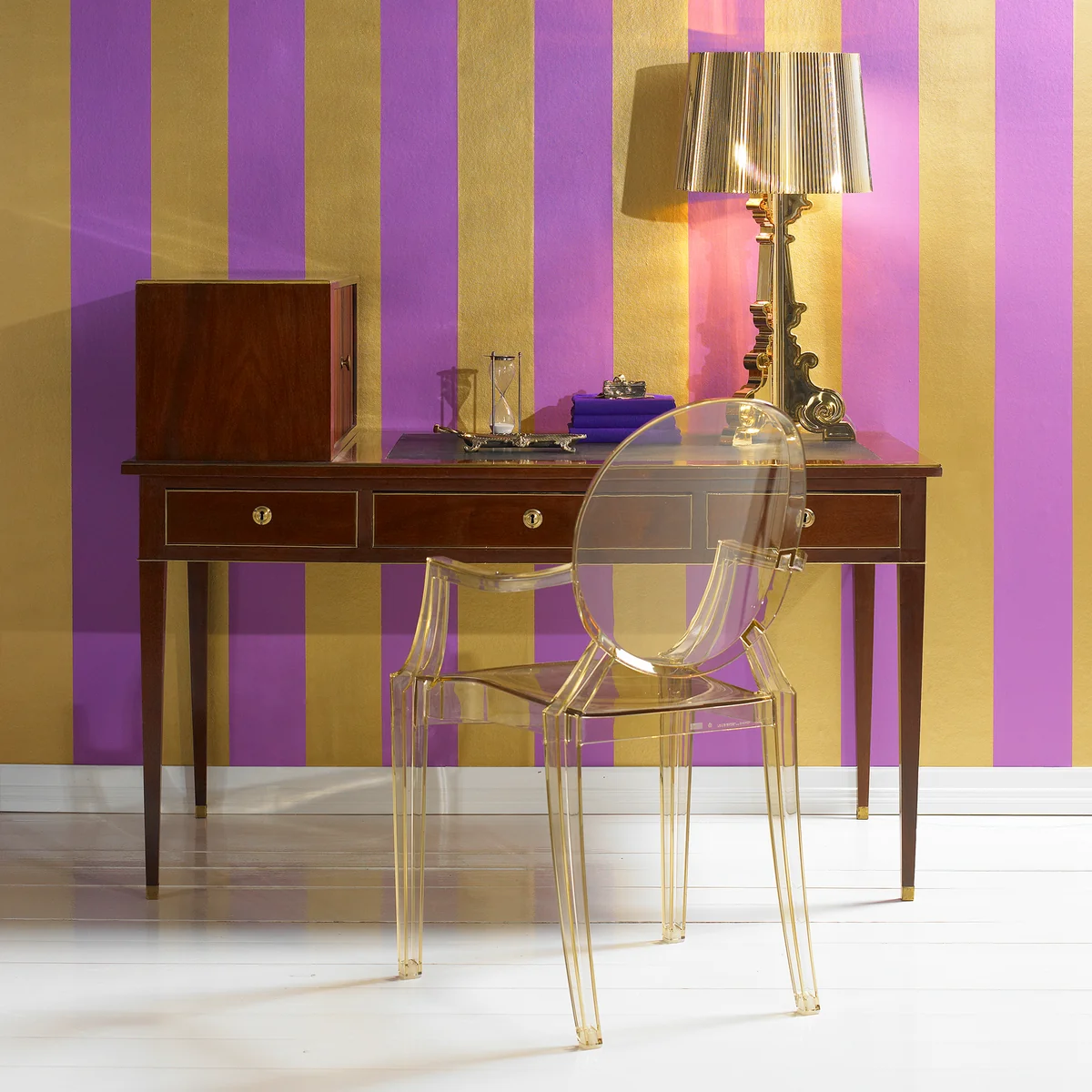 Een comfortabele fauteuil van transparant en gekleurd polycarbonaat met een ontwerp geïnspireerd op de Louis Quinze stijl. Een prachtig en fascinerend modern eerbetoon aan de barokstijl uit 2002, ontworpen door sterontwerper Philippe Starck.
