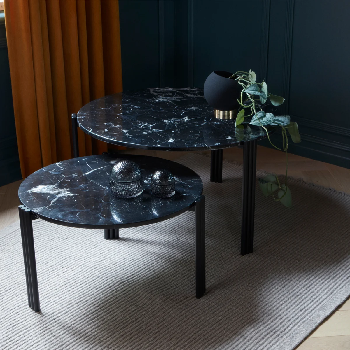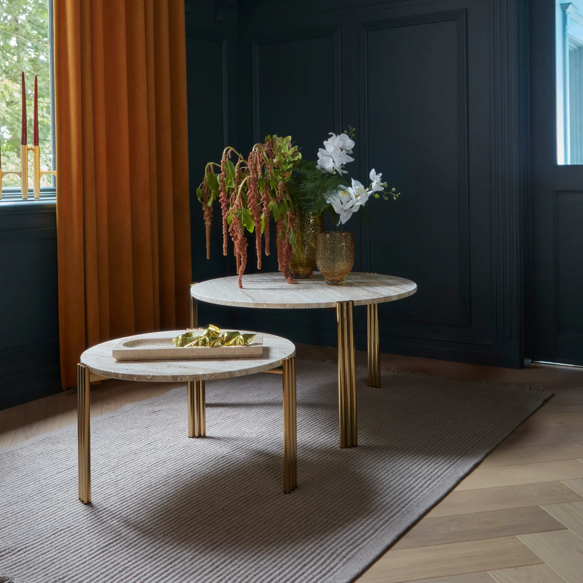 Het eenvoudige ontwerp is versierd met doordachte details op de tafelpoten die de marmeren en travertijnen tafelbladen sierlijk en waardig ondersteunen. Gecombineerd vormen de tafels een waar kunstwerk dat een blikvanger wordt in de woonkamer. Ze kunnen een overheersend effect creëren en worden aangevuld met andere decoratieve accenten.