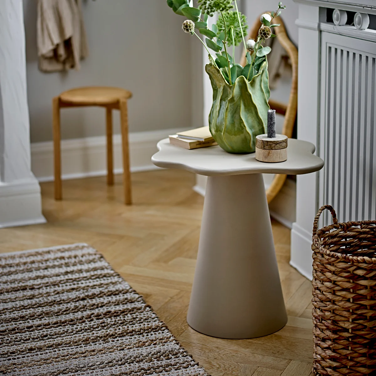 Bloomingville De Soller bijzettafel van, gemaakt van hoogwaardig aluminium, is gecoat met een elegante beige lak die een subtiel contrast vormt met het robuuste karakter van het metaal. Met zijn organisch gebogen vorm voegt de tafel een natuurlijk en charmant element toe aan elke woonruimte en helpt hij een gezellige en uitnodigende sfeer te creëren. Als opbergmeubel naast de bank of als decoratief hoogtepunt in de gang, de Soller bijzettafel maakt indruk met zijn veelzijdigheid en stijlvolle esthetiek.