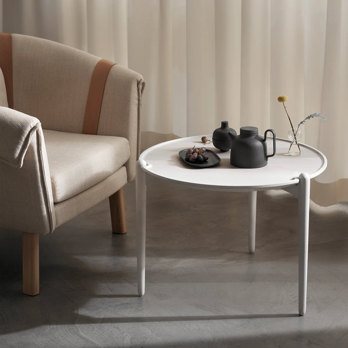De Aria bijzettafel van de IJslandse ontwerpster Dögg Guðmundsdóttir voor Design House Stockholm creëert een luchtige illusie. De poten en het tafelblad lijken op het eerste gezicht los van elkaar te staan - het ronde blad zweeft bijna in de lucht. Deze illusie wordt gecreëerd door de taps toelopende poten die iets boven het omlijste blad uitsteken. Zij houden het bovenblad stevig op zijn plaats en creëren een evenwicht tussen het gevoel van zweven en duurzaamheid.