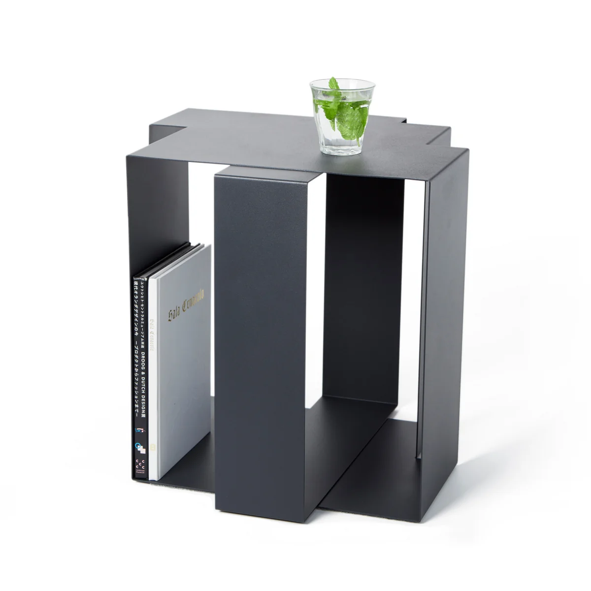 De bijzettafel is gemaakt van gepoedercoat staal en is verkrijgbaar in verschillende kleuren. Horizontaal of verticaal gepositioneerd is de Shifted Square decoratief en praktisch naast de bank in de woonkamer of naast het bed in de slaapkamer. Door de luchtige constructie kunt u ook tijdschriften, kranten, dekens en nog veel meer onder de plank opbergen.