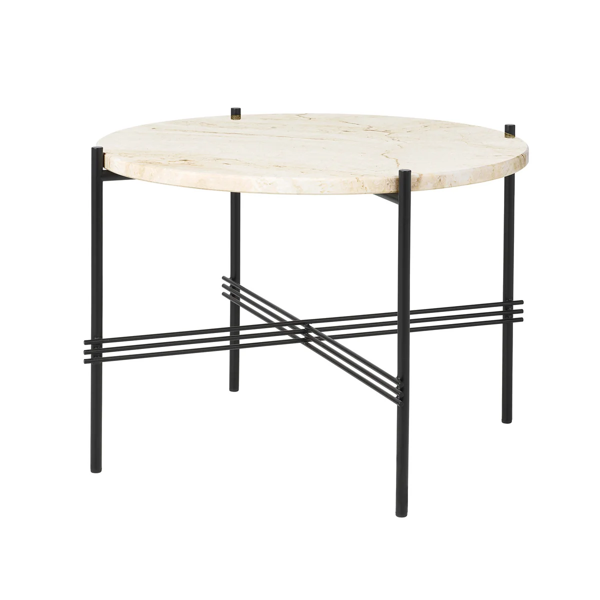 De Travertine De salontafel van Gubi is een veelzijdige salontafel die zijn energie put uit stijlvolle contrasten: Slanke metalen frames ontmoeten de stabiele top van prachtige travertijnsteen. Het is gemaakt door het ontwerpersduo GamFratesi voor het restaurant "The Standard" in Kopenhagen. Met zijn sculpturale uitstraling en het edele materiaal past hij perfect in de sfeer en is hij geschikt voor de bank, als salontafel of in de hotellobby voor de presentatie van tijdschriften.