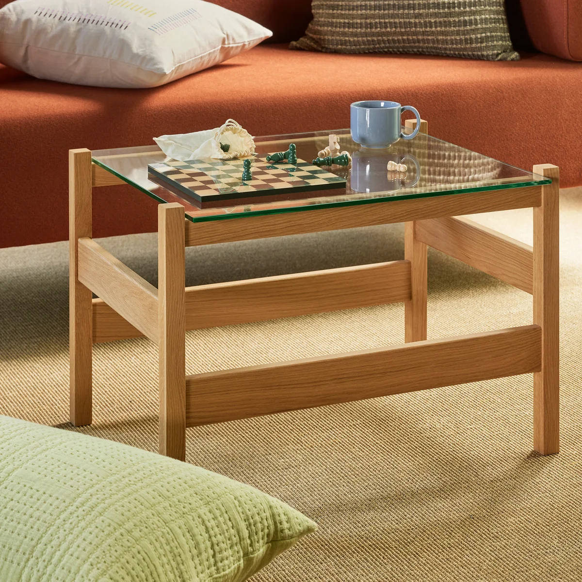 Hübsch Interior De Ledge bijzettafel van combineert op elegante wijze natuurlijke materialen met modern design. Het eiken frame en eiken fineer vormen een warm contrast met het glazen tafelblad. Deze combinatie geeft de tafel een lichte en luchtige uitstraling die harmonieus past bij verschillende inrichtingsstijlen.