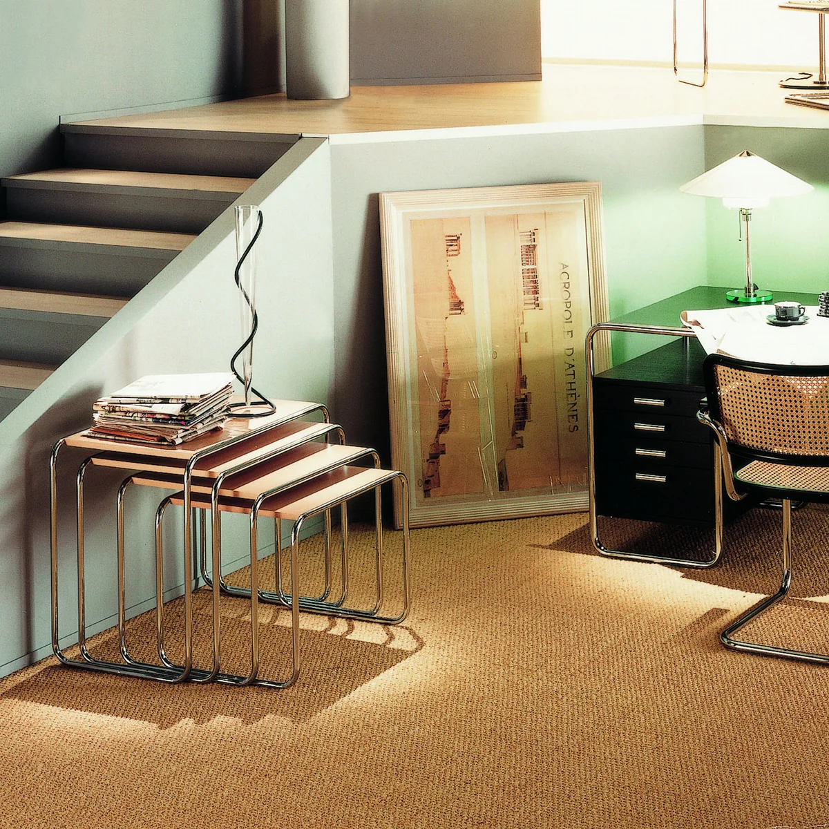 De bijzettafel kan als set of afzonderlijk in verschillende hoogtes worden gecombineerd en in elkaar worden geschoven om ruimte te besparen. B 9 Het is dus een echte klassieker met functionele aspecten, waardoor hij in verschillende ruimtes kan worden gebruikt: van de woonkamer tot de slaapkamer.