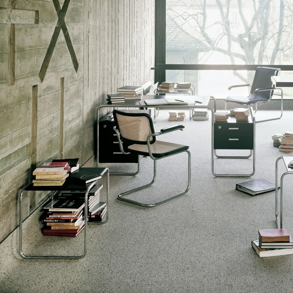 B 9 Thonet De bijzettafel van Marcel Breuer was een van de stalen bijzettafels die in 1925/26 werden ontworpen en die vandaag de dag nog steeds in een herziene versie worden geproduceerd. B 9 In het Bauhaus-gebouw van Walter Gropius in Dessau werd de bijzettafel gebruikt in de kantine. Vandaag de dag heeft het zijn weg gevonden naar het woongedeelte, waar het indruk maakt in verschillende hoogtes en kleuren die naar wens gecombineerd kunnen worden.