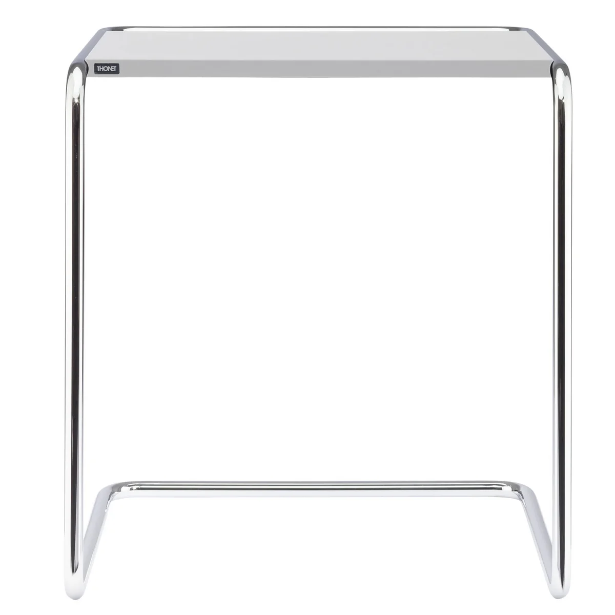 B 97 Thonet De tafel van Marcel Breuer werd al in 1933 ontworpen en is nu een van de klassiekers onder de stalen buismeubelen. Het ontwerp maakte niet alleen indruk door het innovatieve gebruik van stalen buizen, maar ook door de uiterst praktische vorm, waardoor de tafel dankzij de open zijde naar de fauteuil, het bed of de bank kan worden getrokken.