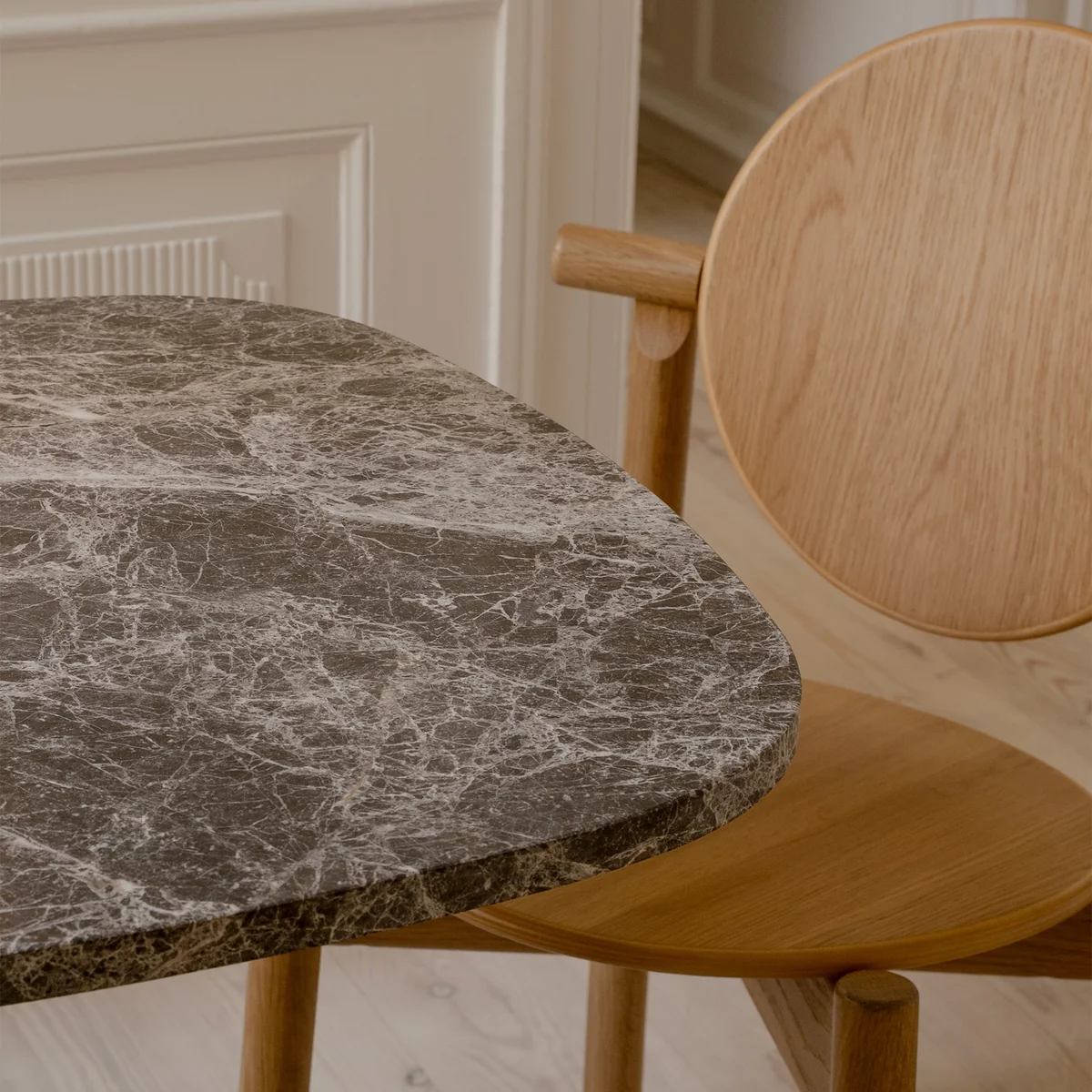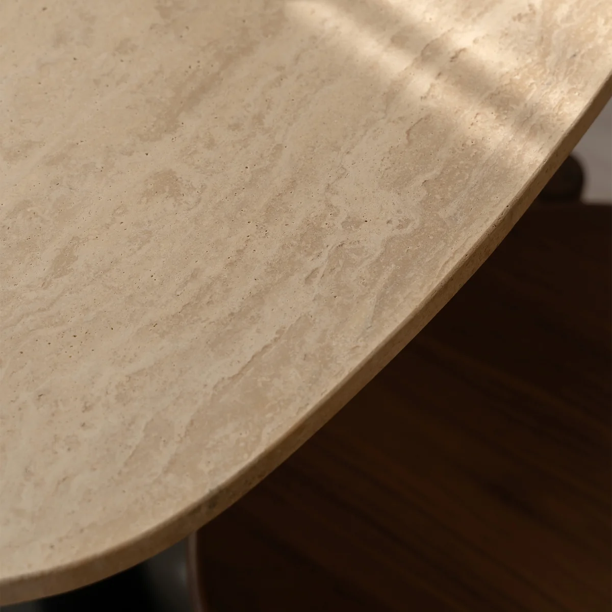 Gather is gemaakt met een stalen frame en een marmeren of travertijnen tafelblad en maakt indruk met zijn stabiliteit en tijdloze esthetiek. In de woonkamer, in de keuken of in een café - deze tafel past zich moeiteloos aan verschillende omgevingen aan en biedt een stijlvolle plek voor koffie, boeken of decoratie.