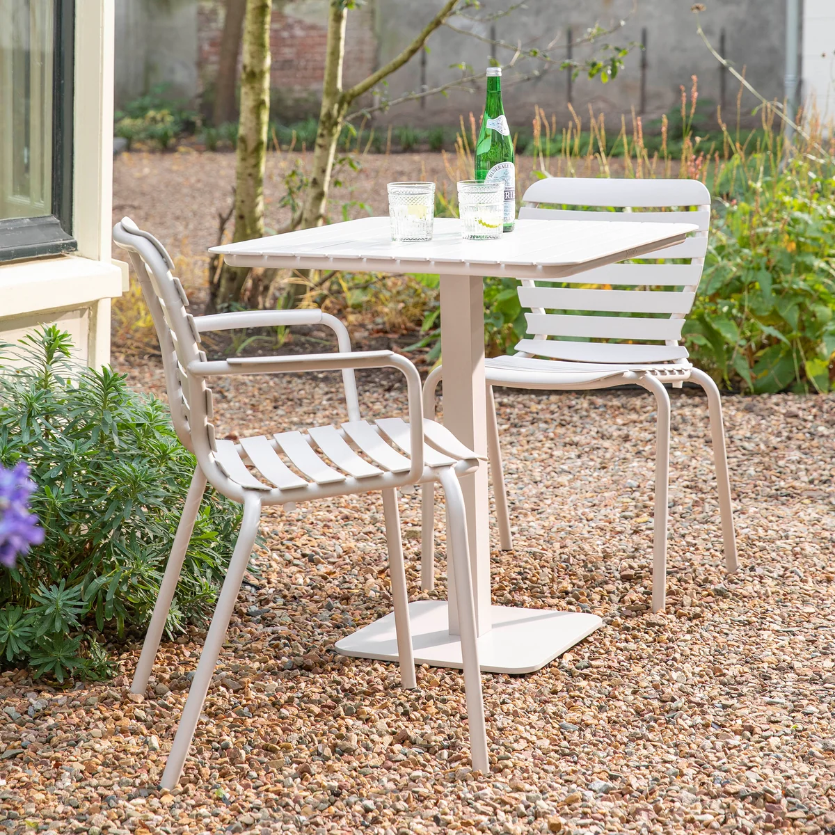 De heldere lijnen en het verfijnde ontwerp zijn het resultaat van een samenwerking tussen het Nederlandse label Zuiver en de gerenommeerde studio APE. Er is aandacht besteed aan elk detail: De licht hellende tafelpoten zorgen voor een hoge mate van stabiliteit, terwijl de fijne uitsparingen in het tafelblad ervoor zorgen dat regenwater gemakkelijk weg kan lopen.