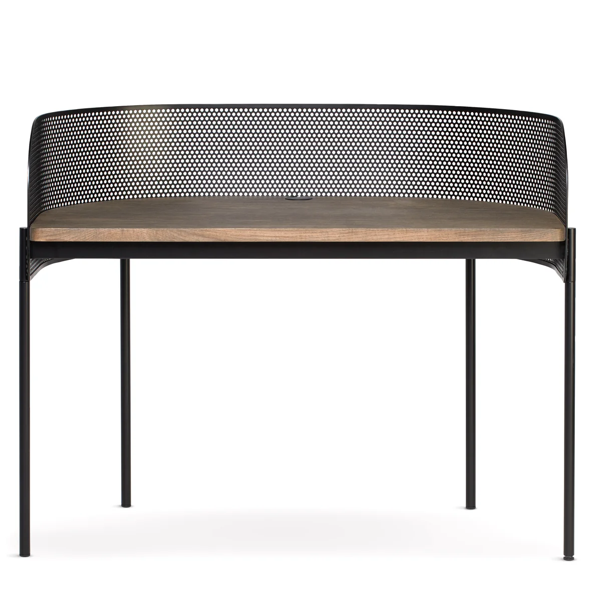Het ontwerp is verfrissend minimalistisch en wordt gekenmerkt door een filigraan stalen frame met vier smalle poten waarop een halfrond tafelblad van gerookt eikenfineer is geëntroniseerd. De plaat is omgeven door een geperforeerde geperforeerde plaat die bedoeld is om de werknemer te beschermen tegen invloeden van buitenaf. Daarnaast is deze achterwand ook ideaal voor het bevestigen van notities, het plaatsen van de hoofdtelefoon of het vastzetten van magneten.