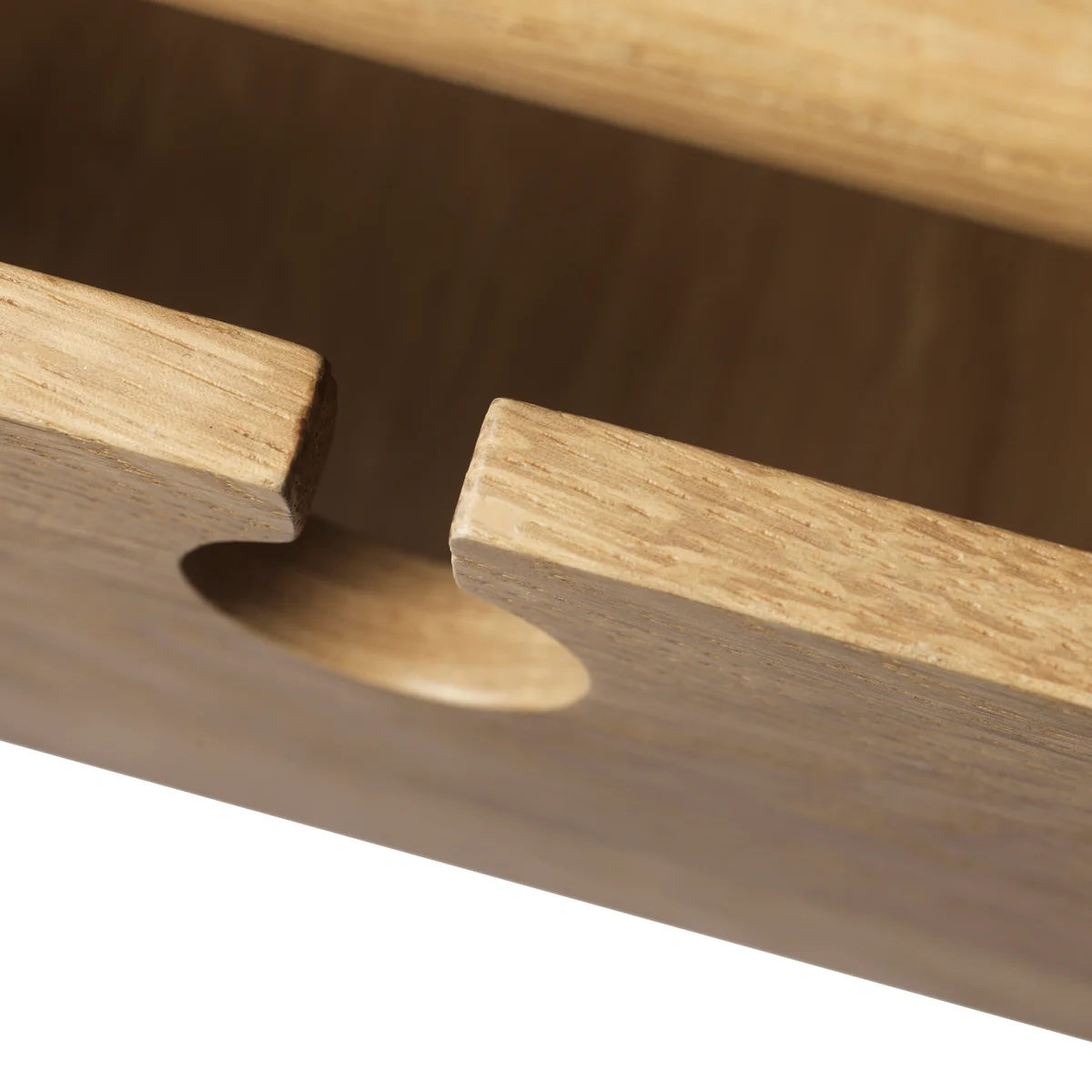 Het product is gemaakt van eikenhout en is verkrijgbaar in verschillende kleuren en maten.