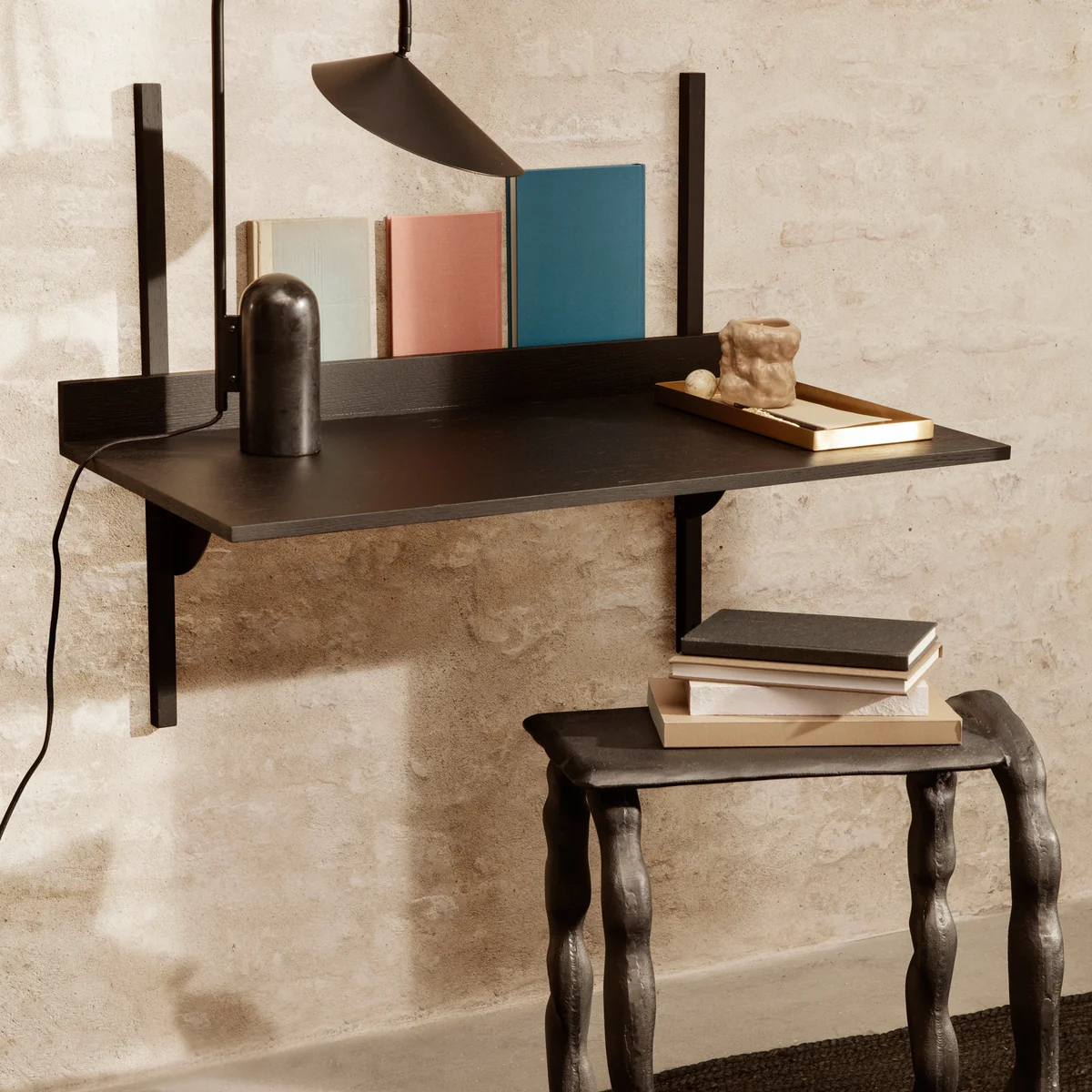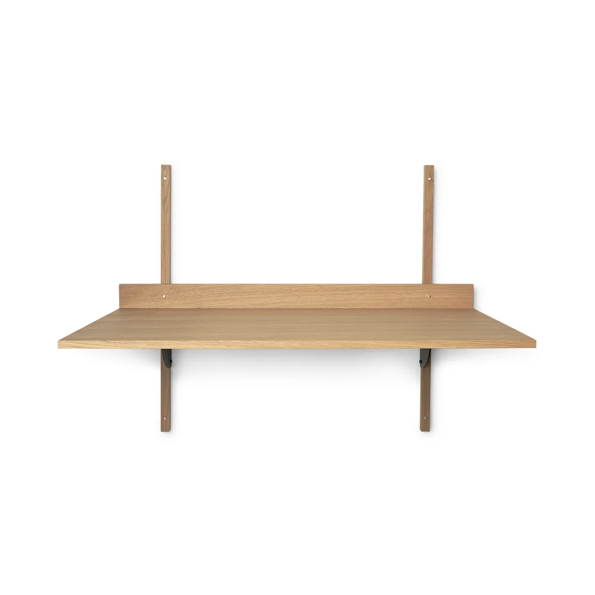 De Sector Het bureau van Ferm Living kenmerkt zich door zijn robuuste eenvoud en de klassieke combinatie van hout en messing. Het kan worden gebruikt als een onafhankelijk oppervlak of worden gecombineerd met de Sector Wandplanken kunnen op alle mogelijke manieren worden gecombineerd om een geïntegreerd en samenhangend werkgebied te creëren. Een korte rand aan het einde van de tafel vormt een klein, smal oppervlak dat ideaal is voor handgeschreven notities of een favoriete foto.