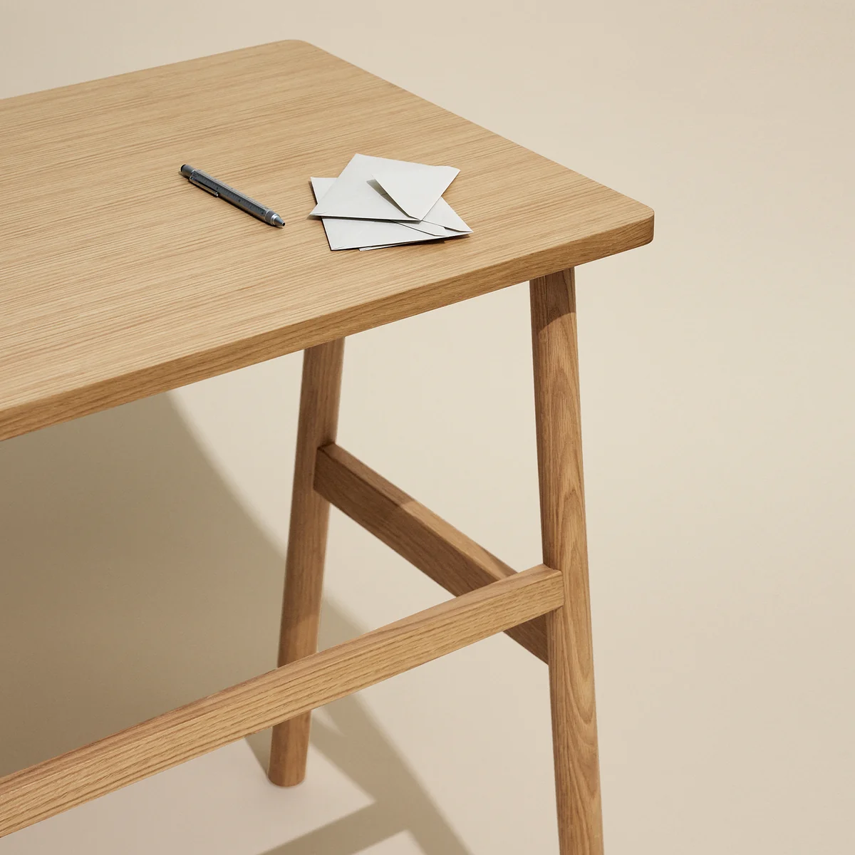 Het Acorn bureau van het Deense bedrijf Hübsch Interior is een geweldige aanvulling op de woonkamer met zijn duidelijk ontworpen lijnen en structuren. Het bureau is gemaakt van FSC-gecertificeerd eikenfineer en maakt indruk met zijn licht uitlopende voorkant en rechte achterpoten. De rechte, smalle houten stijlen zorgen voor een minimalistische uitstraling.