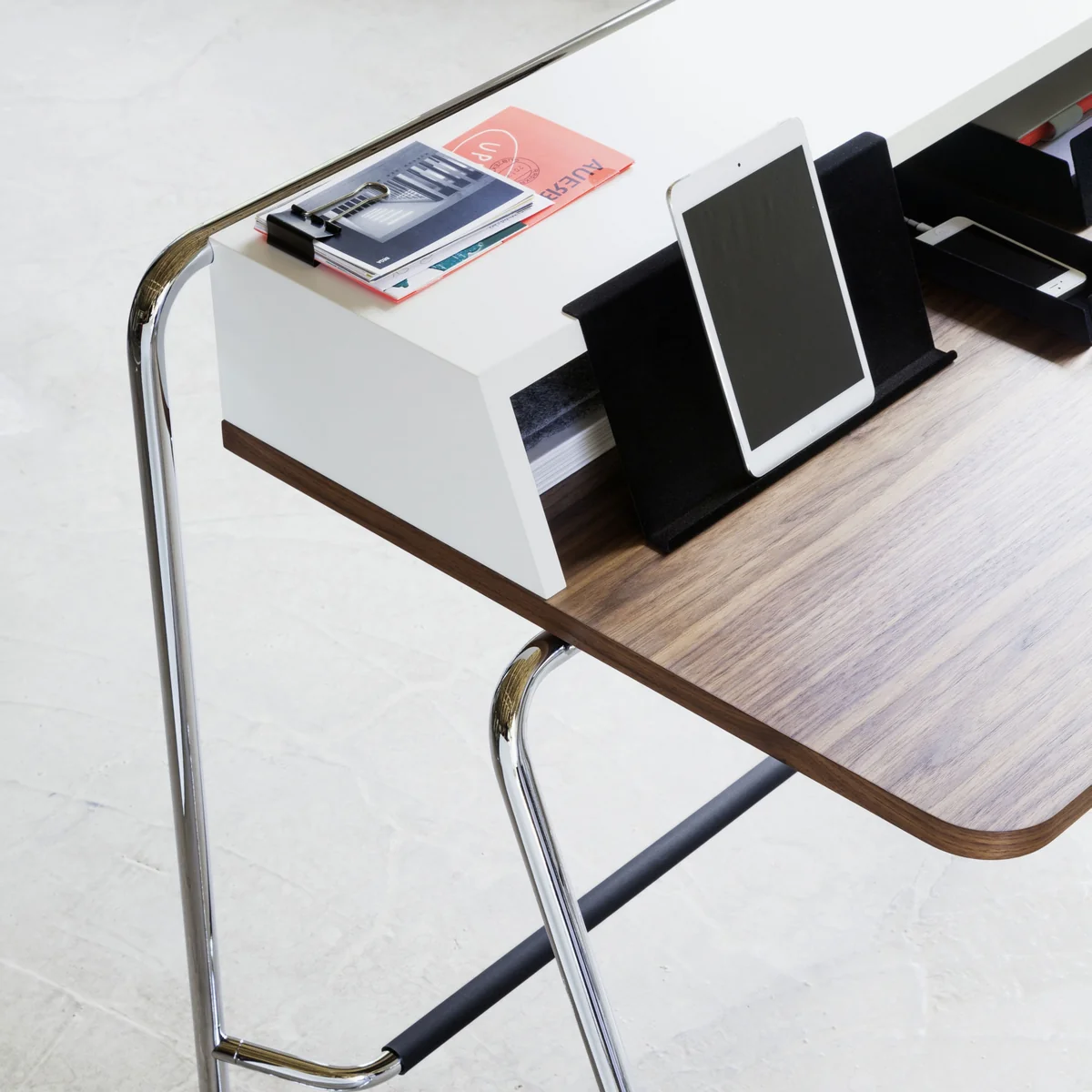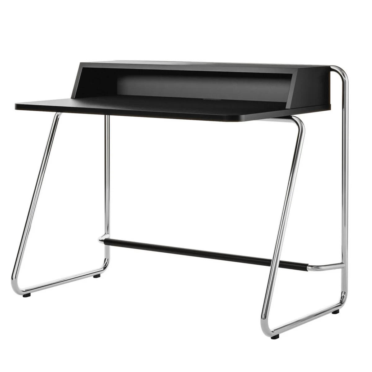 De secretaire is verkrijgbaar met een frame van verchroomde stalen buizen of gelakt in subtiele kleuren. De geïntegreerde voetsteun zorgt voor comfort, zelfs bij langdurig zitten.