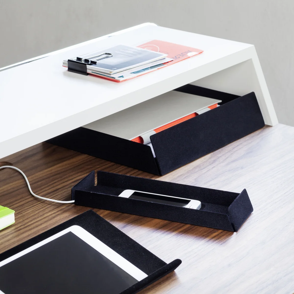Het tafelblad is verkrijgbaar in verschillende uitvoeringen van massief hout. De kabels worden discreet van de tafel naar de contactdoos geleid dankzij een net dat onder het tafelblad is bevestigd en de magnetische clips aan de achterkant van het stalen buizenframe, zodat ze het heldere uiterlijk van de tafel niet verstoren.