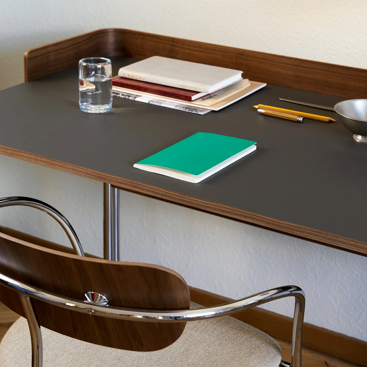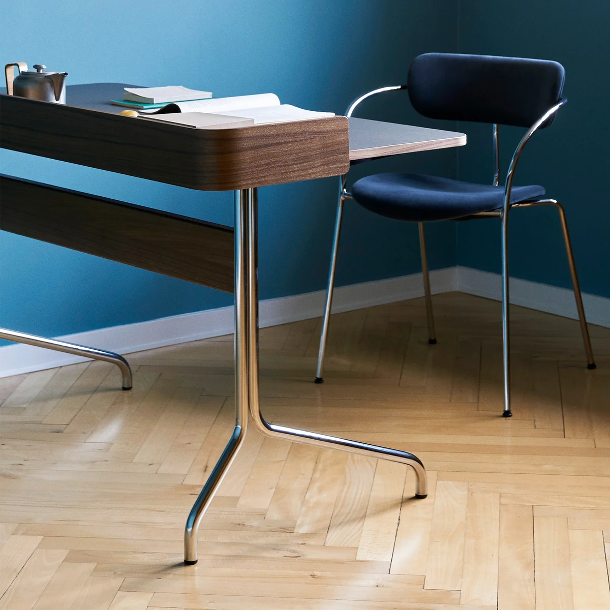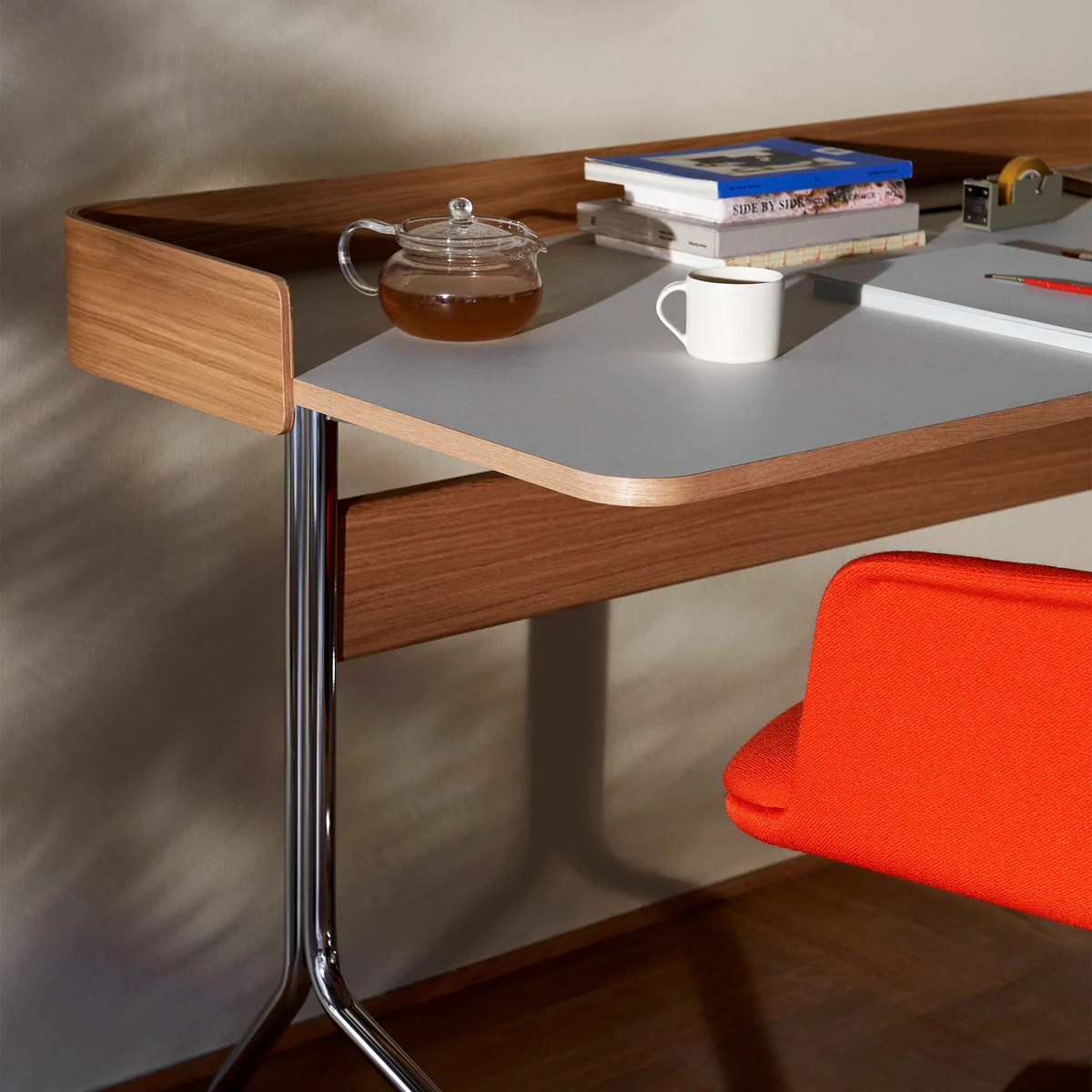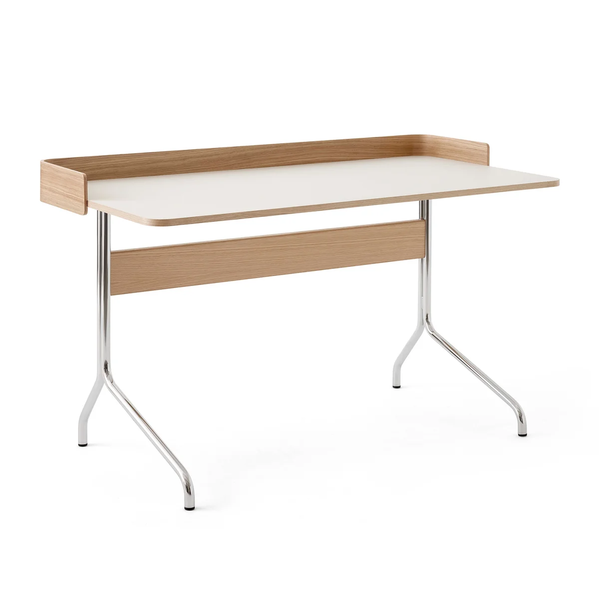 Het bureau Pavilion AV17 van & tradition is ontworpen door het Finse ontwerpduo Anderssen & Voll. Na het ontwerp van de Pavilion stoelen, is het slanke en functionele ontwerp nu ook verkrijgbaar als bureau, dat niet alleen geschikt is voor op kantoor, maar ook uitstekend geschikt is voor het thuiskantoor. De ontwerpers hebben bijzondere aandacht besteed aan de functionaliteit van het thuiskantoor. De rand van fineer zorgt niet alleen voor een visueel contrast, maar voorkomt ook dat voorwerpen vallen en maakt het mogelijk om er schrijfinstrumenten op te leggen.