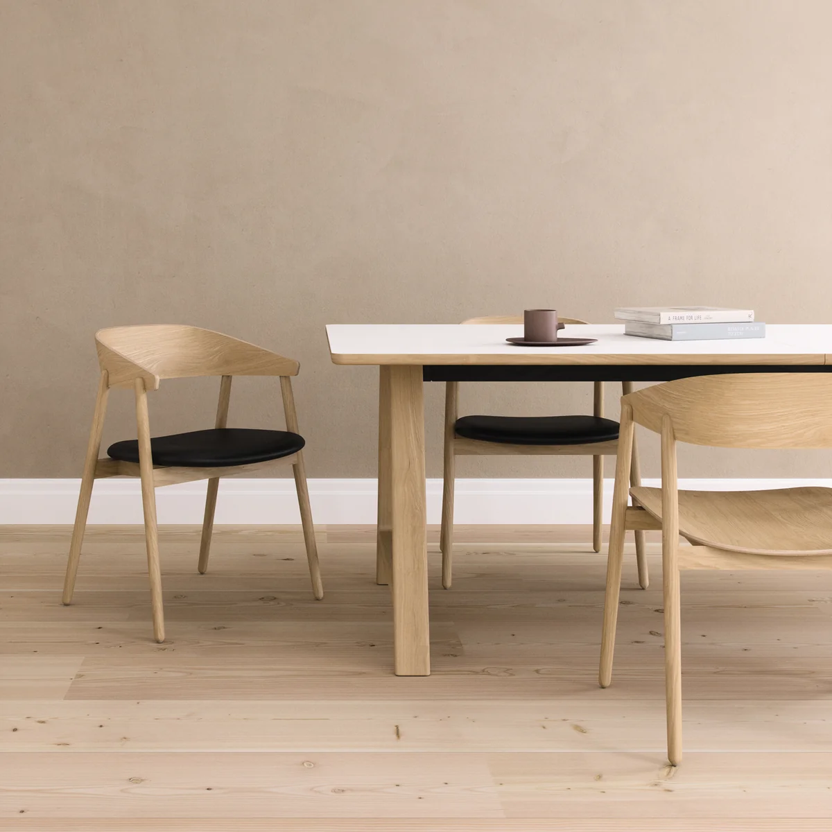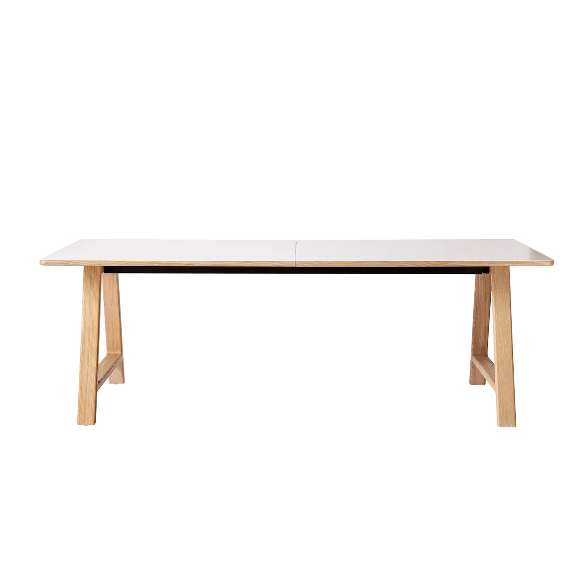 De rechthoekige uitschuifbare tafel, gemaakt van robuuste materialen T11 wordt gekenmerkt door zijn duurzaamheid en stevigheid. Het tafelblad, gemaakt van slijtvast wit Pfeiffer laminaat, heeft een glad oppervlak dat wordt aangevuld door een verfijnde rand van massief eikenhout. Het onderstel van de tafel, een klassieker in wit gepigmenteerd eiken, geeft de tafel niet alleen lichtheid maar ook een natuurlijke warmte.