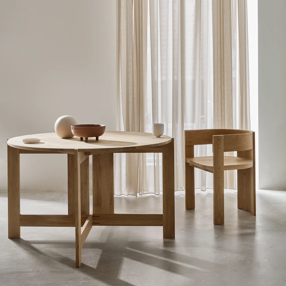 De Collector eettafel van het Deense bedrijf Kristina Dam Studio maakt indruk met zijn rustieke uitstraling en minimalistische, eenvoudige silhouet. De tafel bestaat uit een sculpturaal X-vormig onderstel, dat het massief eiken tafelblad optimaal in evenwicht houdt. Collector is dankzij het minimalistische ontwerp heerlijk geschikt voor elke woonsfeer. Het gedetailleerde vakmanschap van de tafel is vanuit elke hoek te zien en benadrukt de natuurlijke schoonheid van het eikenhout.