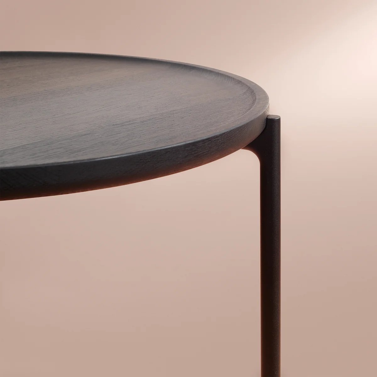 De tafel kan functioneren als salontafel, opbergtafel of nachtkastje en biedt met zijn ronde opbergoppervlak voldoende ruimte voor boeken, vazen en decoraties. De tafel bestaat uit een blad van massief eikenhout en een frame van zwart gepoedercoat aluminium. Het tafelblad doet enigszins denken aan een dienblad door een lichte verhoging aan de rand van de tafel, maar de verhoging is afgerond zodat kruimels en dergelijke gemakkelijk kunnen worden weggeveegd.