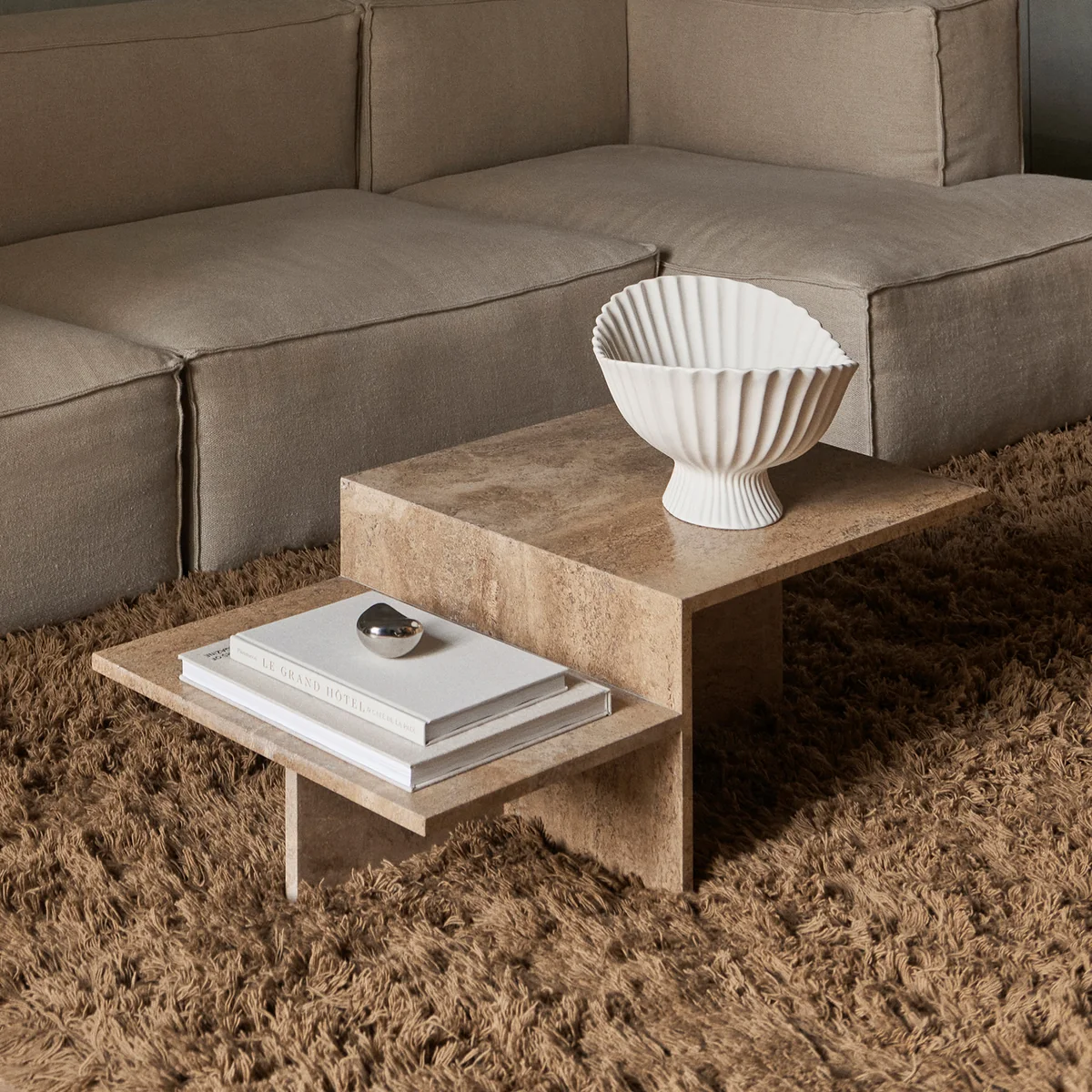 De Distinct salontafel van Ferm Living is oorspronkelijk geïnspireerd door het Japanse minimalisme en onderzoekt complexe structuren op basis van een enkel element. De buitengewone tafel is gemaakt van travertijn in geometrische vormen. De natuurlijke en diverse eigenschappen van de zandkleurige kalksteen zorgen voor een speciaal gevoel dat het architecturale karakter van het meubel onderstreept.