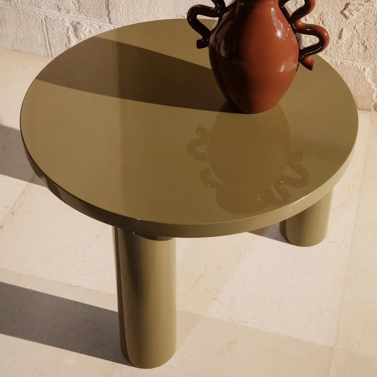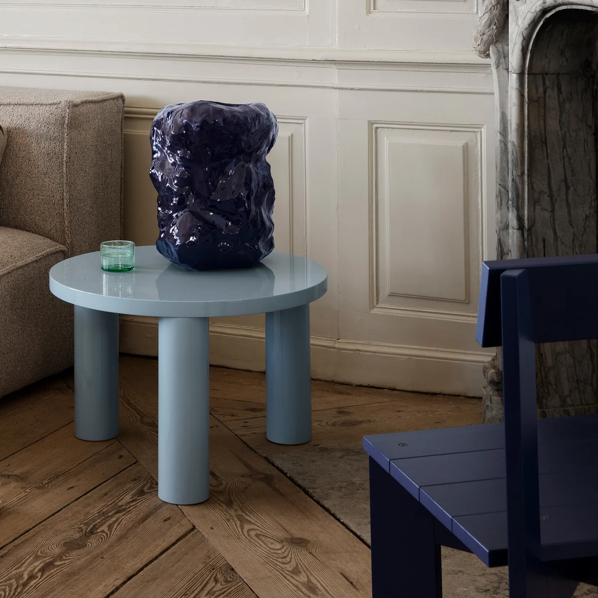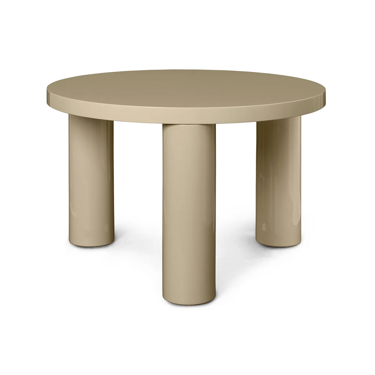 De Post salontafel van de Deense fabrikant Ferm Living is geïnspireerd op het brutalisme en biedt veel ruimte met zijn grote, ronde vorm. De salontafel is gemaakt van FSC®-gecertificeerd hout en afgewerkt met een hoogglans pianolak. Drie massieve, cilindervormige poten ondersteunen het robuuste tafelblad.