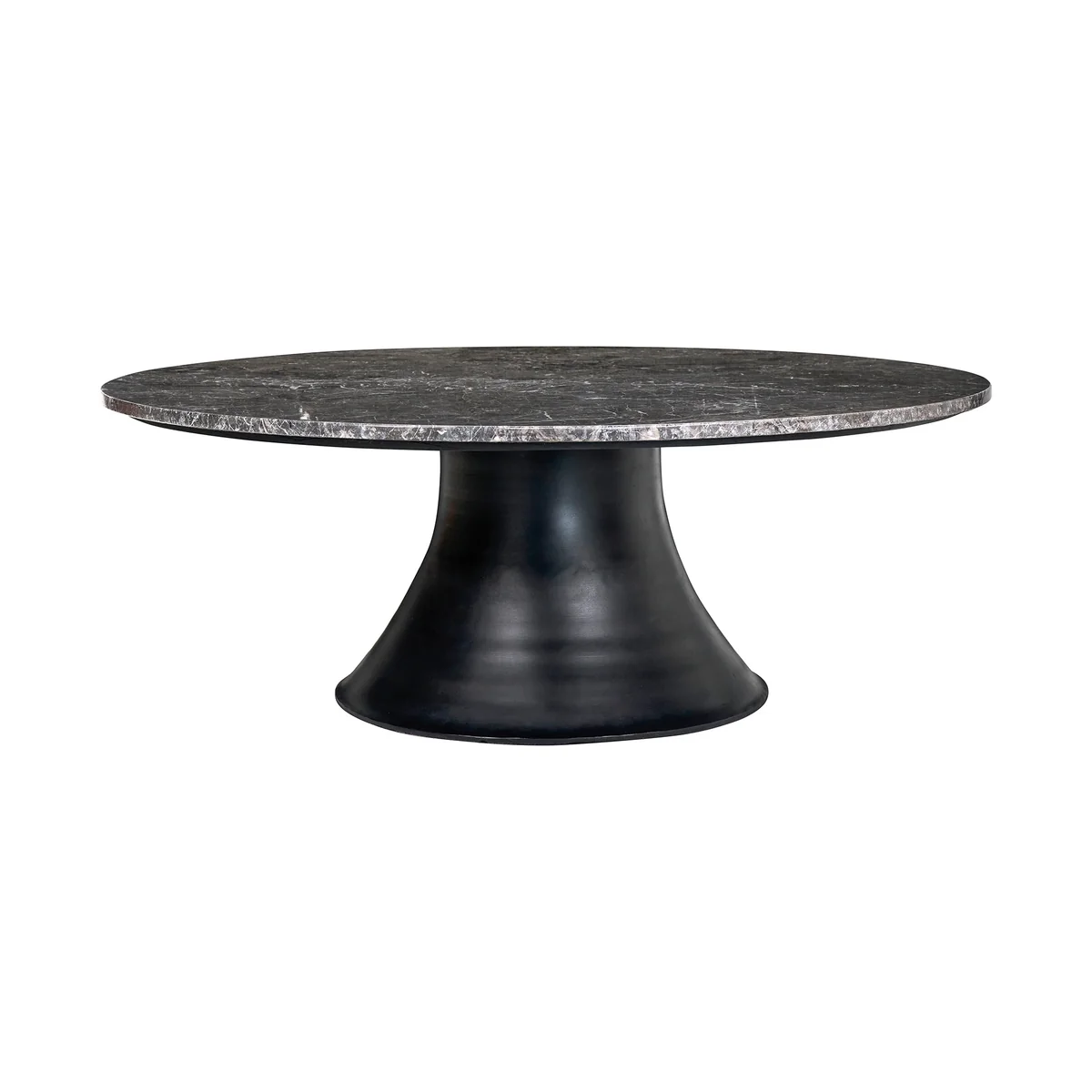 Deze handgemaakte salontafel combineert luxe materialen met tijdloos design. Het gepolijste marmeren blad in warm bruin geeft de tafel een verfijnde uitstraling, terwijl het stevige gietijzeren onderstel zorgt voor duurzaamheid en stabiliteit. De ronde vorm maakt hem zowel functioneel als esthetisch aantrekkelijk en een blikvanger in elke woonkamer.