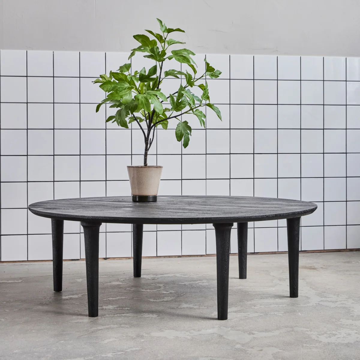 Het ronde tafelblad rust op een sculpturaal ontworpen basis, waarbij de vorm en de poten een harmonieuze eenheid vormen. Dit creëert een speciale visuele diepte die de tafel een opvallende aanwezigheid in de woonkamer geeft. Het matzwarte oppervlak benadrukt de heldere lijnen en versterkt het moderne karakter van het ontwerp.