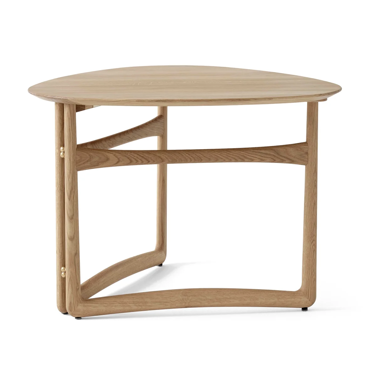 Met als doel een veelzijdig meubel te creëren dat zich aanpast aan de omgeving, creëerde het designduo Hvidt & Mølgaard in 1956 de salontafel Drop Leaf HM5 . & tradition . Als onderdeel van de Drop Leaf-serie met bladvormige tafelbladen heeft de salontafel dezelfde gebogen houten frames als de grote eettafel en een eenvoudig inklapbaar ontwerp. Dit maakt de salontafel voor de bank of de fauteuil in het woongedeelte tot een blikvanger en maakt het mogelijk om deze compact en eenvoudig op te klappen wanneer dat nodig is.