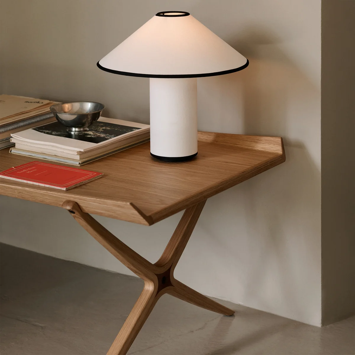 & De X salontafel van Hvidt Mølgaard voor & Tradition is een meesterwerk van Scandinavisch vakmanschap. Oorspronkelijk ontworpen in 1959, maakt de tafel indruk met zijn opvallende X frame, geïnspireerd door antieke Egyptische klapstoelen. Het hoge kwaliteit eiken fineer tafelblad met elegant gevormde rand voegt een verfijnde touch toe aan het ontwerp, terwijl het zwart stalen frame zorgt voor stabiliteit en een moderne esthetiek.