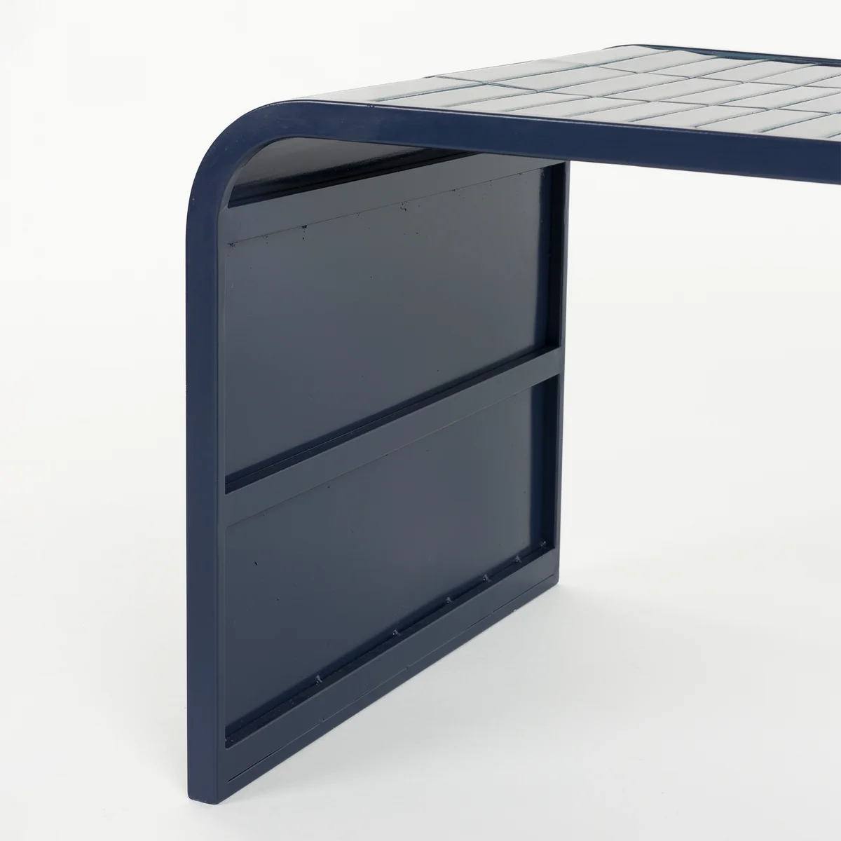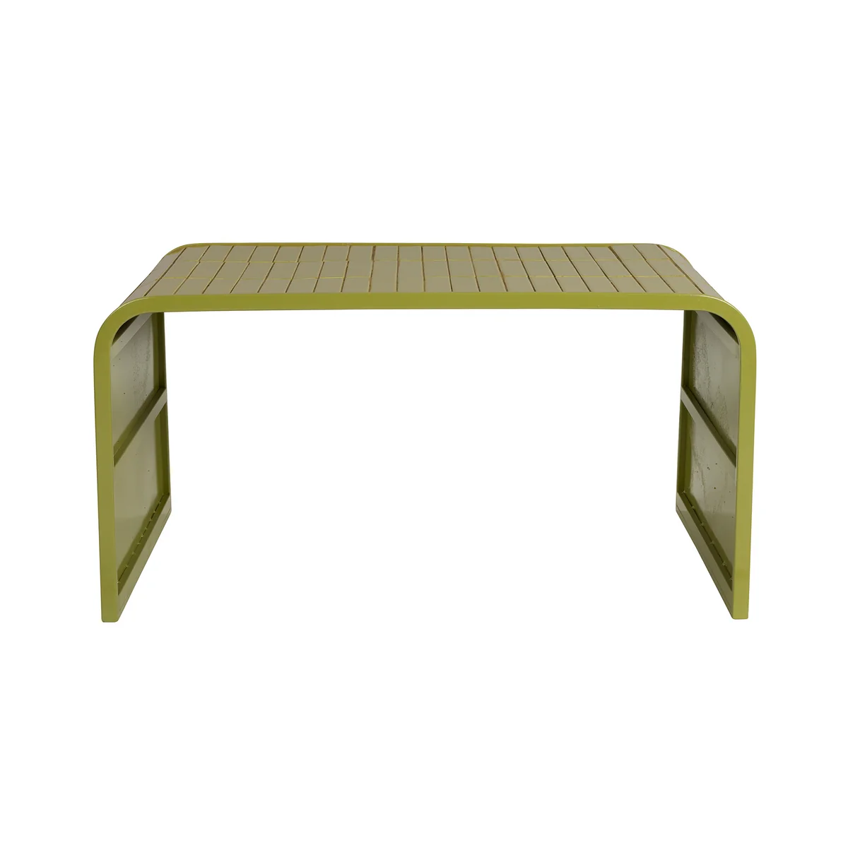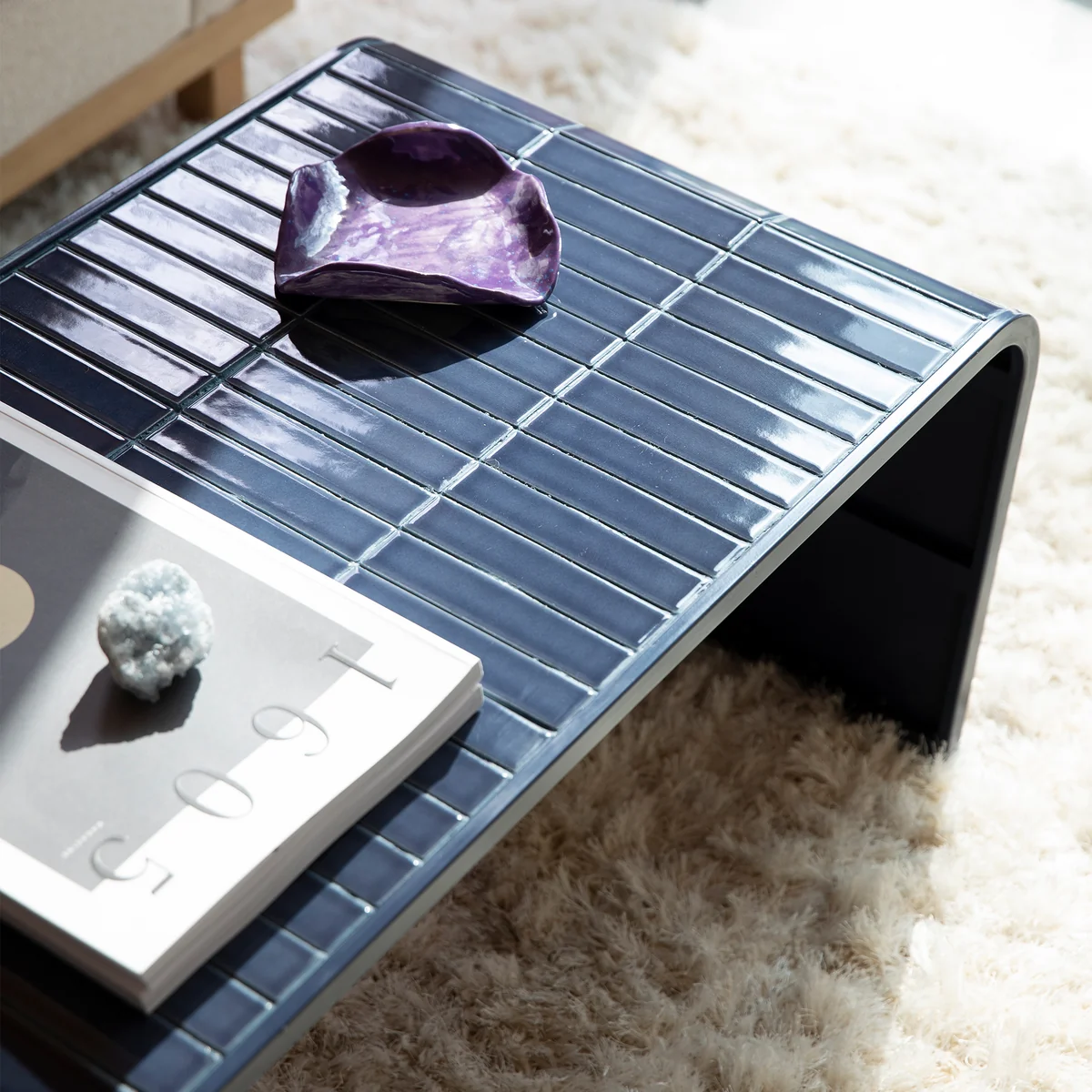 De salontafel Tiles brengt beweging in het spel. Zijn gebogen vorm nestelt zich elegant tussen bankelementen en fungeert als een vloeiende schakel in de kamer. Maar wat het echt een statement maakt, is het oppervlak: glanzend gelakte, langwerpige tegels die glanzen in levendige kleuren en indrukwekkende reflecties creëren wanneer het licht erop valt. De combinatie van de tegelachtige afwerking en het heldere metalen frame geeft de tafel een bijna sculpturale uitstraling - speels en gestructureerd tegelijk.
