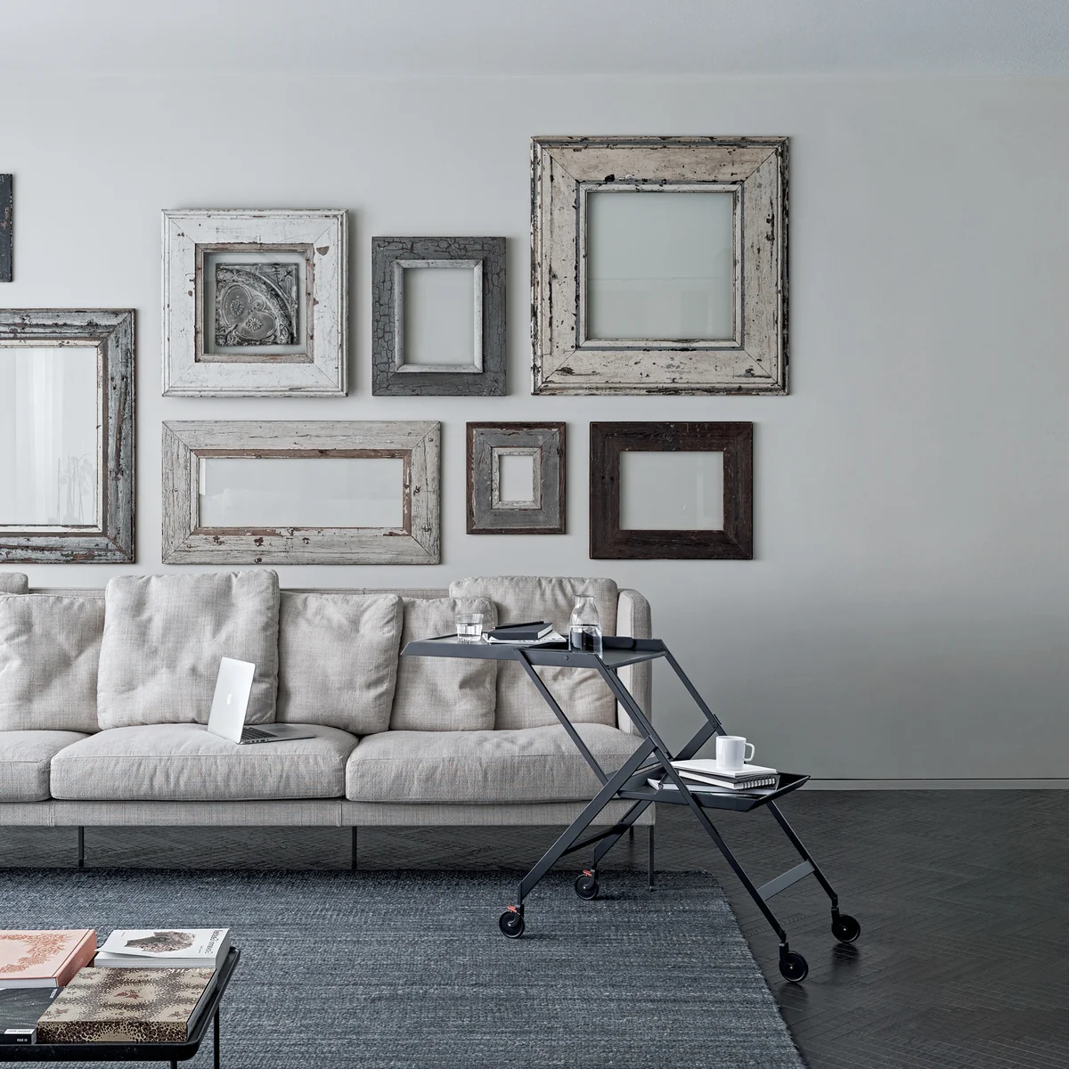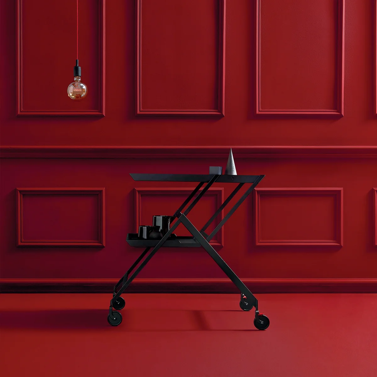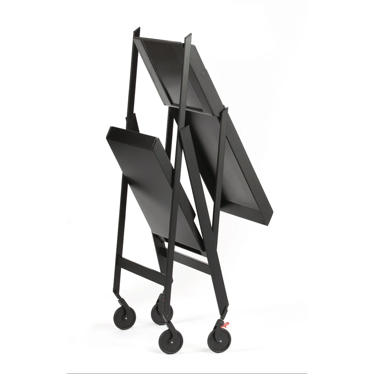 Gebaseerd op het ontwerp van Richard Sapper uit de jaren 1970, de Plico serveerwagen werd ontworpen door Alessi . De elegante serveerwagen is ideaal als minibar voor uw eigen vier muren of voor het serveren van cocktails en kleine hapjes op twee niveaus. De kleine zwarte trolley kan ook worden gebruikt als bijzettafel of nachtkastje. Hij is bijzonder ruimtebesparend - opgevouwen past hij achter een deur of Plico achter een deur of zelfs in kleinere opslagruimtes zonder problemen.