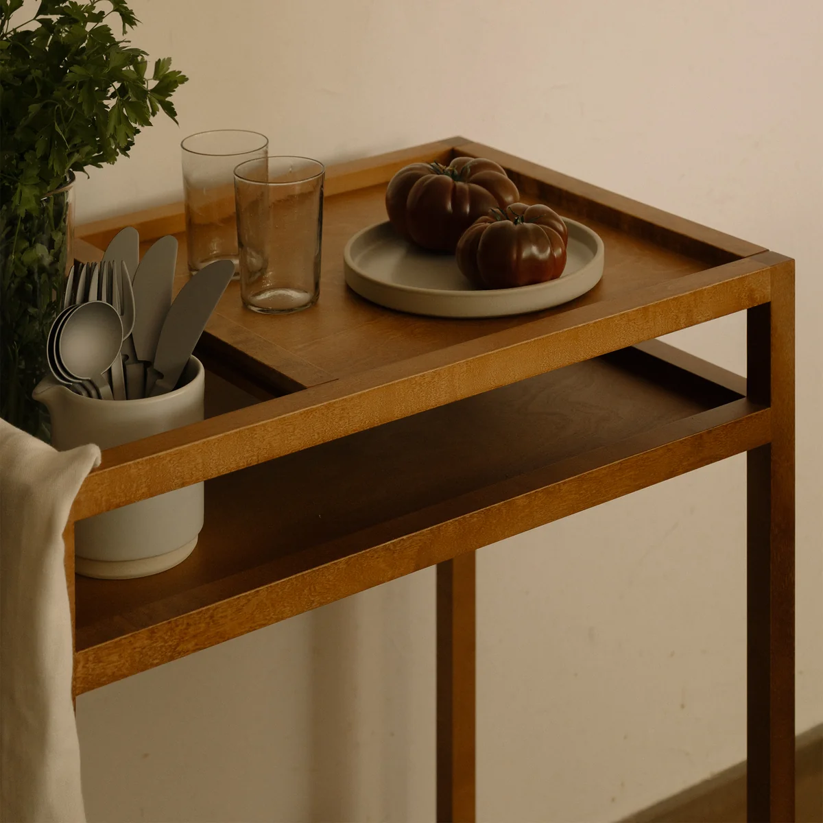 De Ratio trolley van Frama , ontworpen door Ana Magalhães Ilharco en Matilde Cortez de Lobão (Ilo, 2024), herinterpreteert de klassieke bar trolley op een moderne manier. Hij is gemaakt van MDF, berkenfineer en massief berkenhout in een warmbruine kleur en combineert natuurlijke materialen met een heldere, functionele vorm. Dankzij de wielen kan de trolley moeiteloos worden verplaatst, terwijl het verwijderbare dienblad extra flexibiliteit biedt in het dagelijks leven - als serveerwagen, mobiele bar of stijlvolle opberger in de woonkamer.