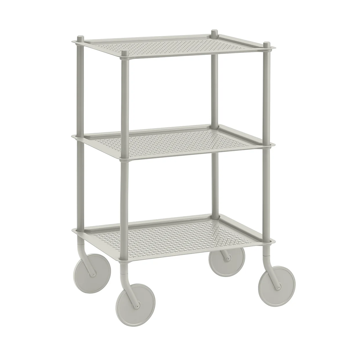 De Flow Muuto zijtrolley van brengt het concept van functioneel design in een moderne context: de gegroefde planken van metaal met reliëf zorgen voor een eigentijdse uitdrukking, terwijl de flexibiliteit van de wielen gebruikers in staat stelt om de trolley van de ene ruimte naar de andere te verplaatsen.