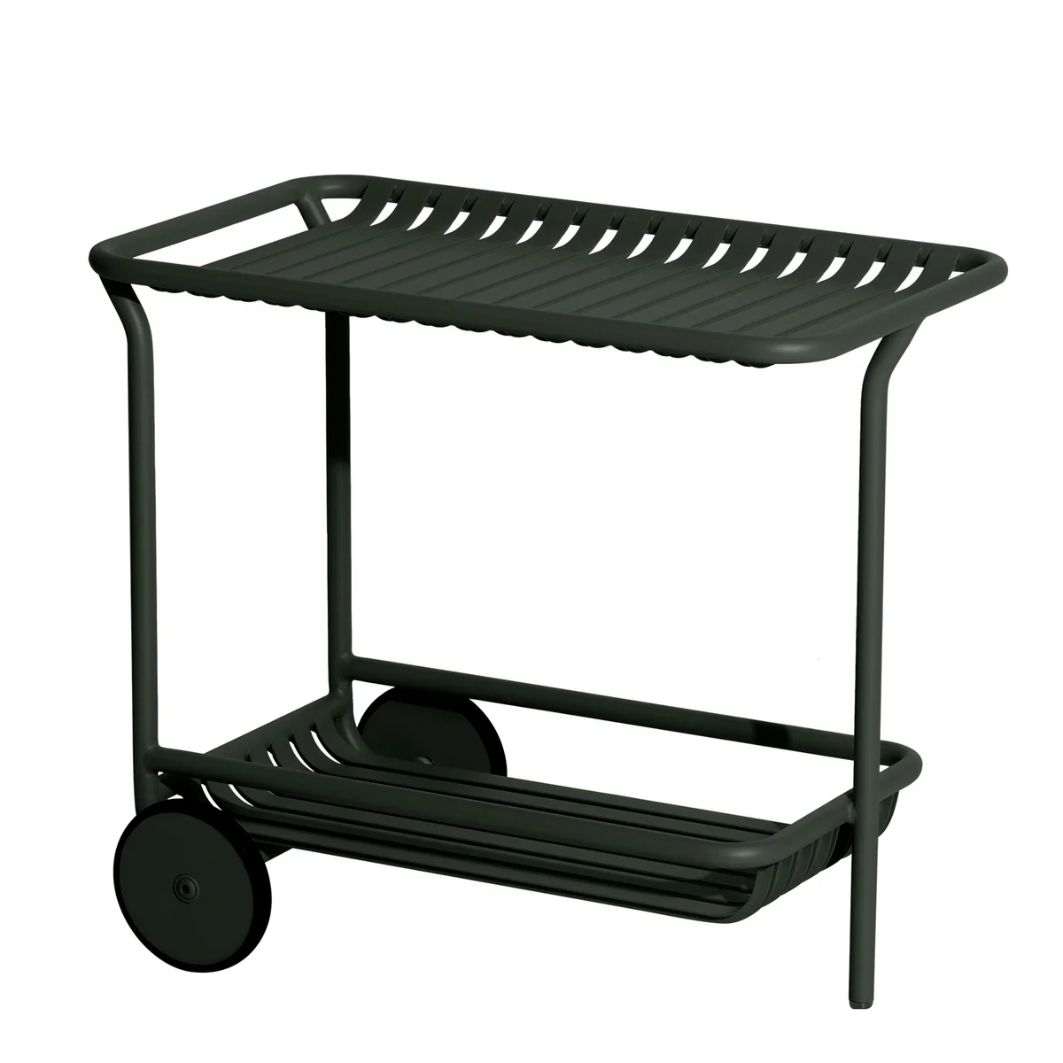 De Week-End trolley Outdoor Petite Friture van was, net als de rest van de serie Week-End serie, is ontworpen voor praktisch en duurzaam gebruik. Hij is gemaakt van aluminium, licht van gewicht en de korrelige en matte epoxyafwerking maakt hem UV- en waterbestendig. De lamellenstructuur voorkomt ook dat water zich verzamelt op de oppervlakken.