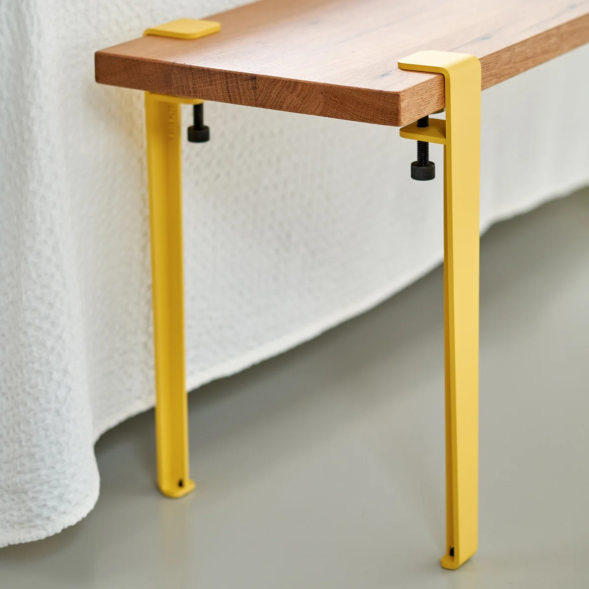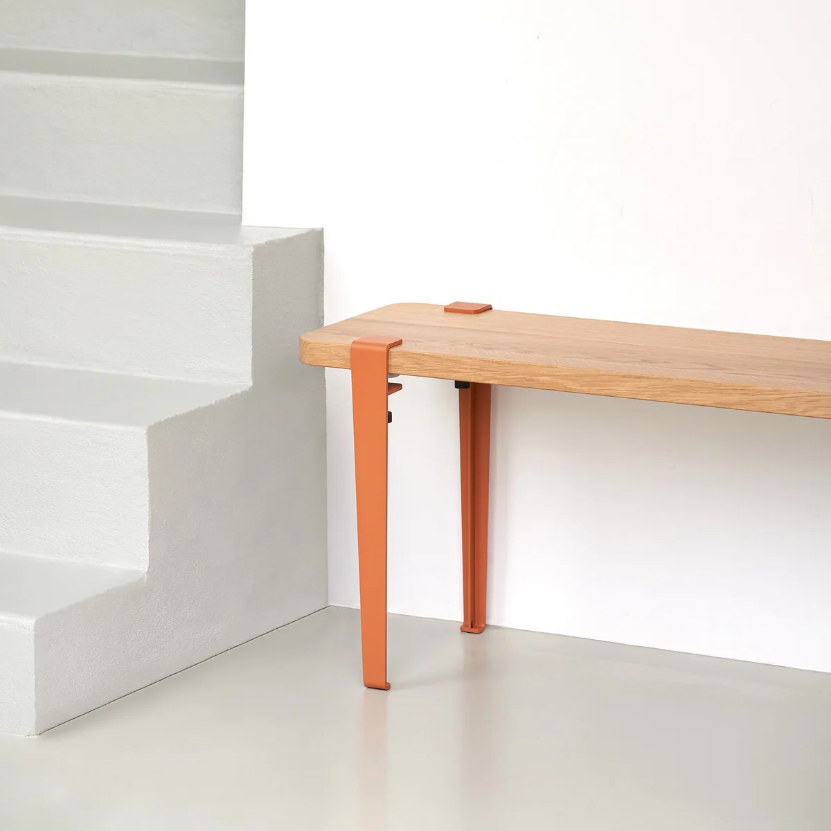 De salontafel en bankpoot van de Franse fabrikant TipToe is een universeel toepasbaar designobject ontworpen voor lage tafels of banken. In combinatie met een rond of rechthoekig houten blad kan hij worden gebruikt om een salontafel of bank op maat te maken. Het product maakt niet alleen indruk met zijn slanke ontwerp, dat een licht industriële flair geeft aan de woonkamer of hal. Het is ook gemaakt van duurzame materialen in Europa en is daarom extreem duurzaam en stabiel. Het kan eenvoudig worden vastgeklemd aan de rand van de houten plank en naar wens worden verplaatst (naar een andere plank).